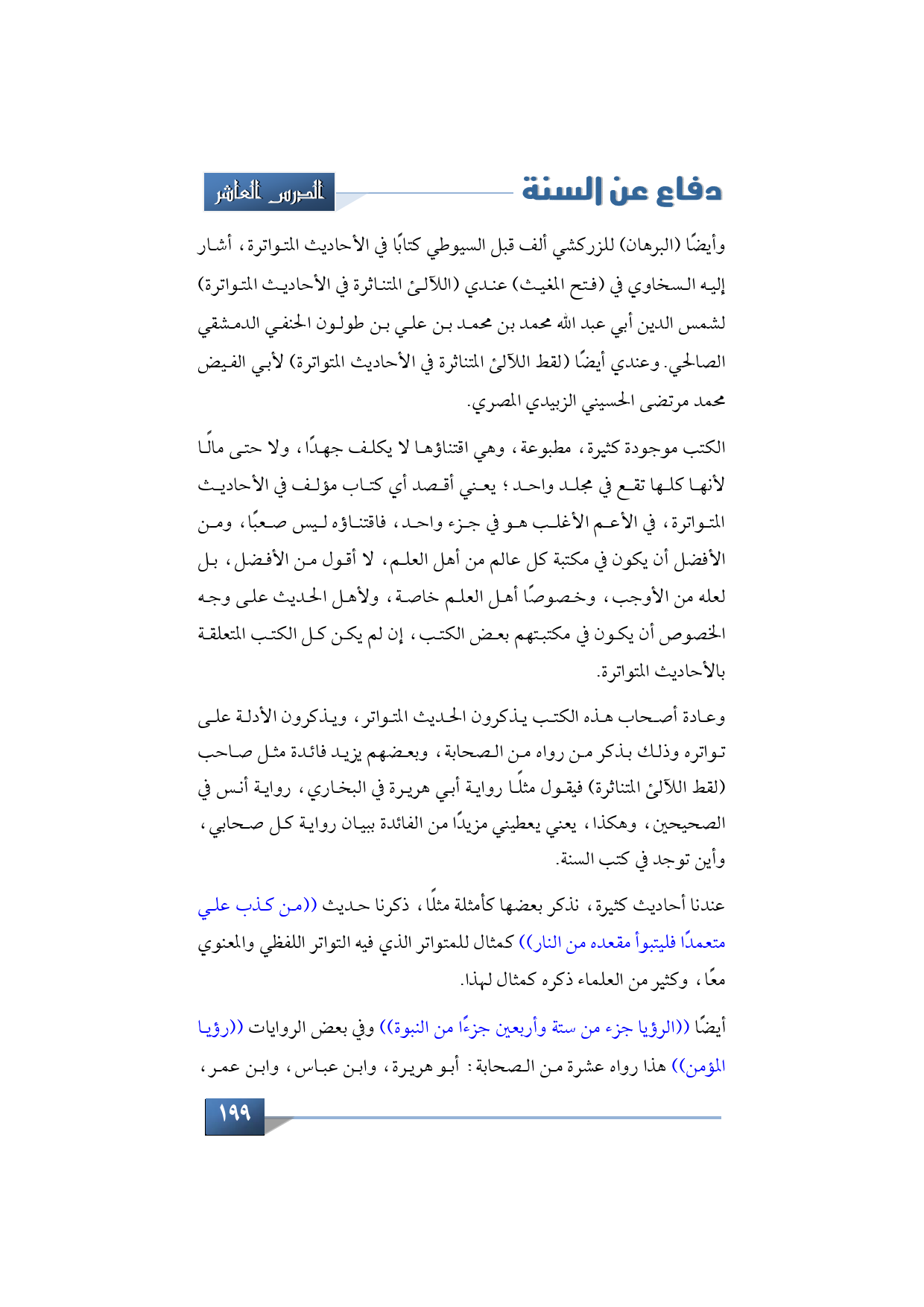 وعادة أصحاب هذه الكتب يذكرون الحديث المتواتر، ويذكرون الأدلة على تواتره وذلك بذكر من رواه من الصحابة، وبعضهم يزيد فائدة مثل صاحب (لقط اللآلئ المتناثرة) فيقول مثلًا رواية أبي هريرة في البخاري، رواية أنس في الصحيحين، وهكذا، يعني يعطيني مزيدًا من الفائدة ببيان رواية كل صحابي، وأين توجد في كتب السنة.