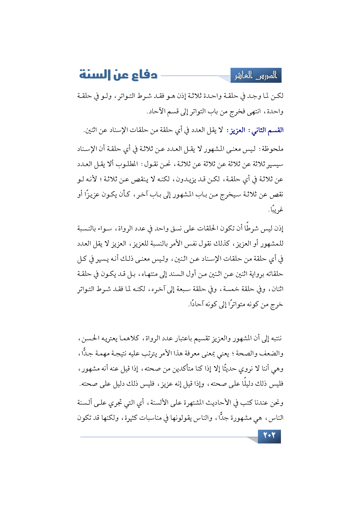 إذن ليس شرطًا أن تكون الحلقات على نسق واحد في عدد الرواة، سواء بالنسبة للمشهور أو العزيز، كذلك نقول نفس الأمر بالنسبة للعزيز، العزيز لا يقل العدد في أي حلقة من حلقات الإسناد عن اثنين، وليس معنى ذلك أنه يسير في كل حلقاته برواية اثنين عن اثنين من أول السند إلى منتهاه، بل قد يكون في حلقة اثنان، وفي حلقة خمسة، وفي حلقة سبعة إلى آخره، لكنه لما فقد شرط التواتر خرج من كونه متواترًا إلى كونه آحادًا.