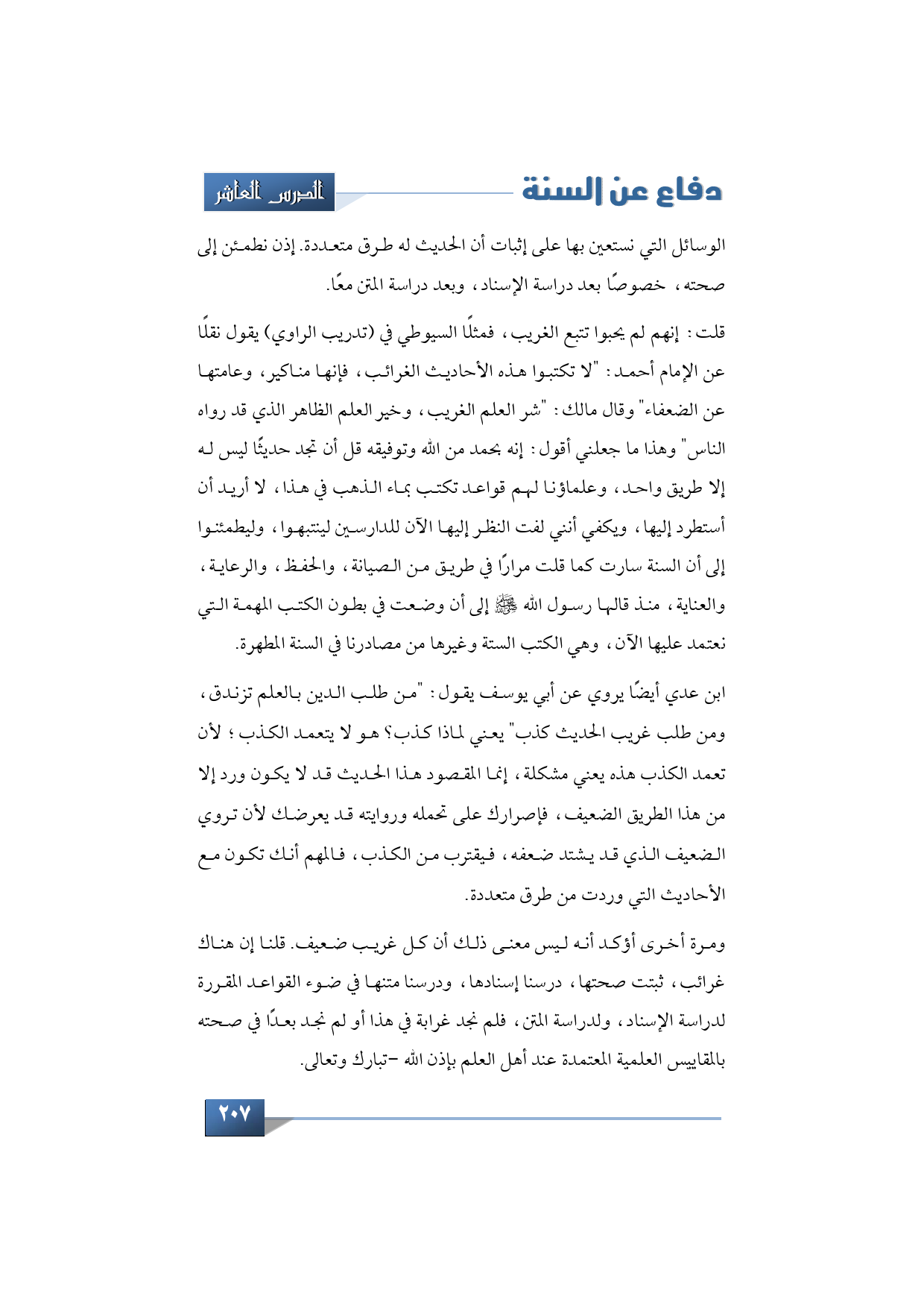 هذه المسائل التي تتعلق بالآحاد وأقسامه، وأنا أعلم أنه يدرس بتفصيل أعمق من ذلك في مادة المصطلح، وفي غيره من المواد، لكن أنا أشير إلى هذا في عجالة نظرًا لأنني سأحتاج إلى بعض المعارف التي ذكرتها، وأنا أتكلم عن الحديث المتواتر، وعن دلالته وعن أهميته، وأيضًا عن حديث الآحاد، وهو الأهم، وعن الرد على الشبه التي أثارها المغرضون تجاه حديث الآحاد.