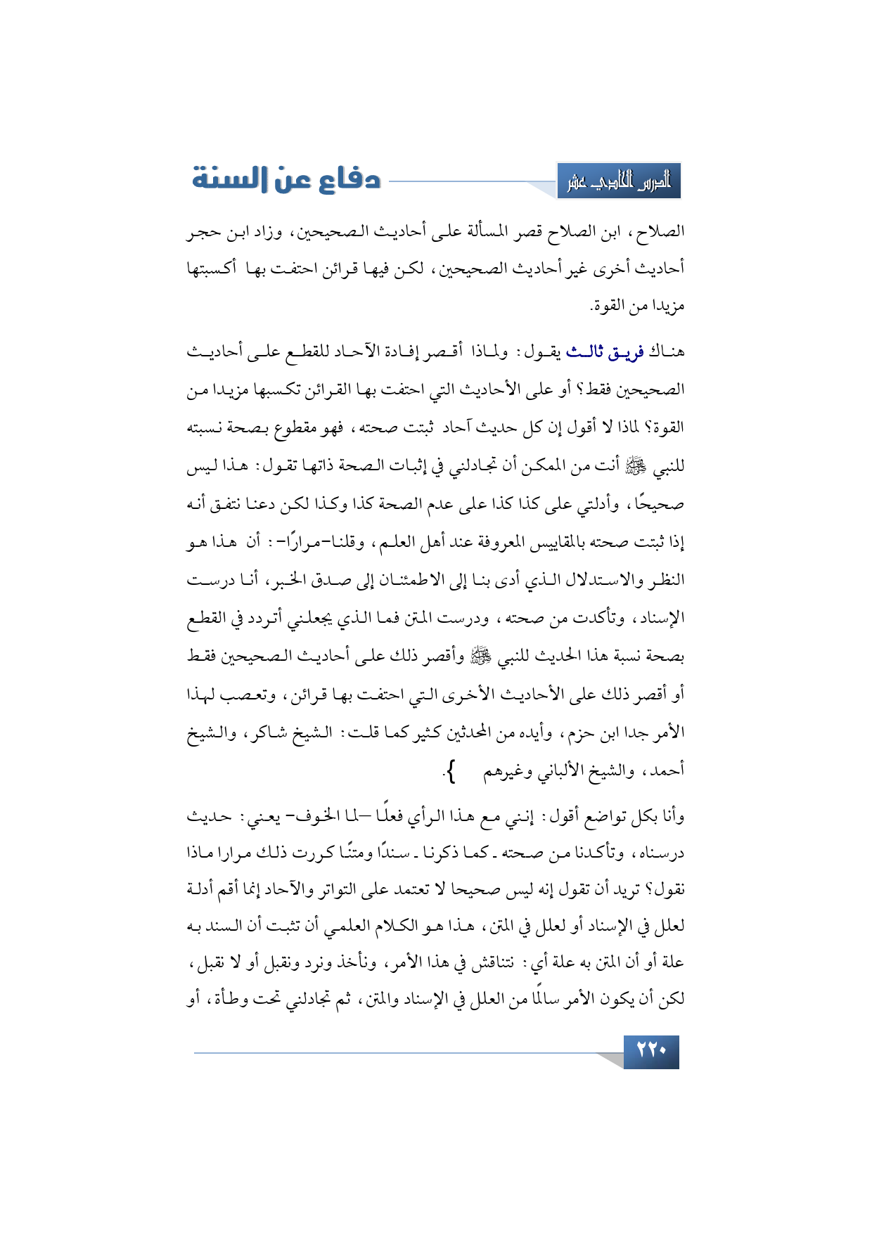 هناك فريق ثالث يقول: ولماذا أقصر إفادة الآحاد للقطع على أحاديث الصحيحين فقط؟ أو على الأحاديث التي احتفت بها القرائن تكسبها مزيدا من القوة؟ لماذا لا أقول إن كل حديث آحاد ثبتت صحته فهو مقطوع بصحة نسبته للنبي -صلى الله عليه وسلم- أنت من الممكن أن تجادلني في إثبات الصحة ذاتها تقول: هذا ليس صحيحًا، وأدلتي على كذا كذا على عدم الصحة كذا وكذا لكن دعنا نتفق أنه إذا ثبتت صحته بالمقاييس المعروفة عند أهل العلم، وأنا قلت -مرارًا-: أن هذا هو النظر والاستدلال الذي أدى بنا إلى الاطمئنان إلى صدق الخبر، أنا درست -كما قلت- الإسناد، وتأكدت من صحته، ودرست المتن فما الذي يجعلني أتردد في القطع بصحة نسبة هذا الحديث للنبي -صلى الله عليه وسلم- وأقصر ذلك على أحاديث الصحيحين فقط أو أقصر ذلك على الأحاديث الأخرى التي احتفت بها قرائن، وتعصب لهذا الأمر جدا ابن حزم، وأيده من المحدثين كثير كما قلت: الشيخ شاكر، والشيخ أحمد، والشيخ الألباني وغيرهم رضي الله عنهم أجمعين ورحمهم أجمعين.