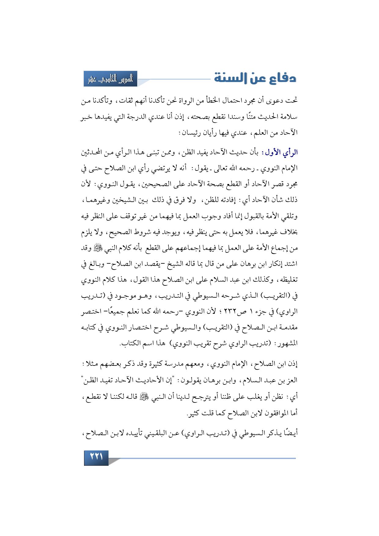الرأي الأول: بأن حديث الآحاد يفيد الظن، وممن تبنى هذا الرأي من المحدثين الإمام النووي ـ رحمه الله تعالى ـ يقول: يعني لا يرتضي رأي ابن الصلاح حتى في مجرد قصر الآحاد أو القطع بصحة الآحاد على الصحيحين، يقول النووي: لأن ذلك شأن الآحاد أي: إفادته للظن ولا فرق في ذلك بين الشيخين وغيرهما، وتلقي الأمة بالقبول إنما أفاد وجوب العمل بما فيهما من غير توقف على النظر فيه بخلاف غيرهما، فلا يعمل به حتى ينظر فيه، ويوجد فيه شروط الصحيح، ولا يلزم من إجماع الأمة على العمل بما فيهما إجماعهم على القطع بأنه كلام النبي -صلى الله عليه وسلم- وقد اشتد إنكار ابن برهان على من قال بما قاله الشيخ -يقصد ابن الصلاح- وبالغ في تغليظه، وكذلك ابن عبد السلام على ابن الصلاح هذا القول، هذا كلام النووي في (التقريب) الذي شرحه السيوطي في التدريب، وهو موجود في (تدريب الراوي) في جزء 1 ص232؛ لأن النووي -رحمه الله كما نعلم جميعًا- اختصر مقدمة ابن الصلاح في (التقريب) والسيوطي شرح اختصار النووي في كتابه المشهور: (تدريب الراوي شرح تقريب النووي) هذا اسم الكتاب.