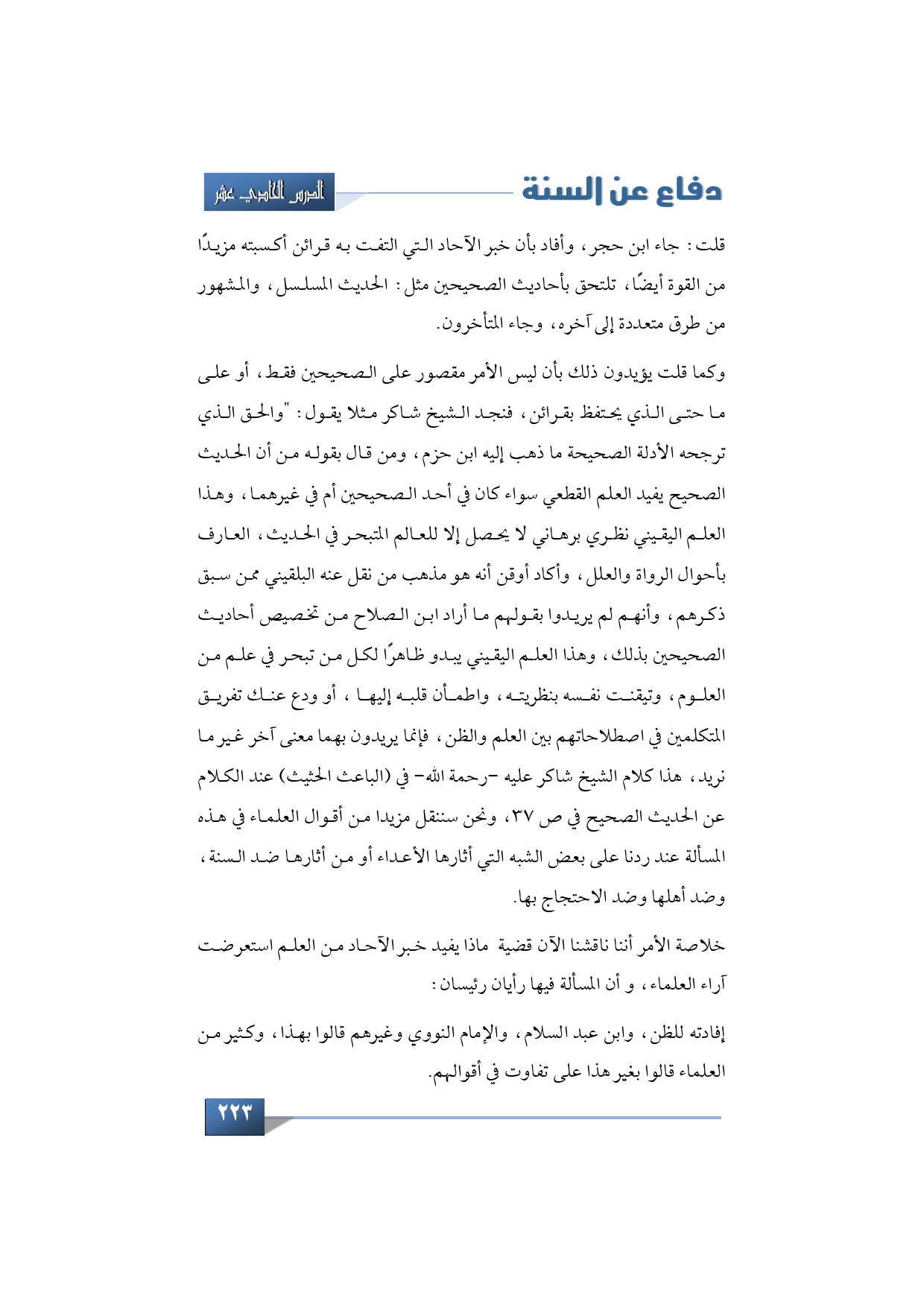 وكما قلت يؤيدون ذلك بأن ليس الأمر مقصور على الصحيحين فقط، أو على ما حتى الذي يحتفظ بقرائن، فنجد الشيخ شاكر مثلا يقول: "والحق الذي ترجحه الأدلة الصحيحة ما ذهب إليه ابن حزم، ومن قال بقوله من أن الحديث الصحيح يفيد العلم القطعي سواء كان في أحد الصحيحين أم في غيرهما، وهذا العلم اليقيني نظري برهاني لا يحصل إلا للعالم المتبحر في الحديث، العارف بأحوال الرواة والعلل، وأكاد أوقن أنه هو مذهب من نقل عنه البلقيني ممن سبق ذكرهم، وأنهم لم يريدوا بقولهم ما أراد ابن الصلاح من تخصيص أحاديث الصحيحين بذلك، وهذا العلم اليقيني يبدو ظاهرًا لكل من تبحر في علم من العلوم، وتيقنت نفسه بنظريته، واطمأن قلبه إليها، أو ودع عنك تفريق المتكلمين في اصطلاحاتهم بين العلم والظن، فإنما يريدون بهما معنى آخر غير ما نريد، هذا كلام الشيخ شاكر عليه -رحمة الله- في (الباعث الحثيث) عند الكلام عن الحديث الصحيح في ص 37، ونحن سننقل أيضا مزيدا من أقوال العلماء في هذه المسألة عند ردنا على بعض الشبه التي أثارها الأعداء أو من أثارها ضد السنة، وضد أهلها وضد الاحتجاج بها.