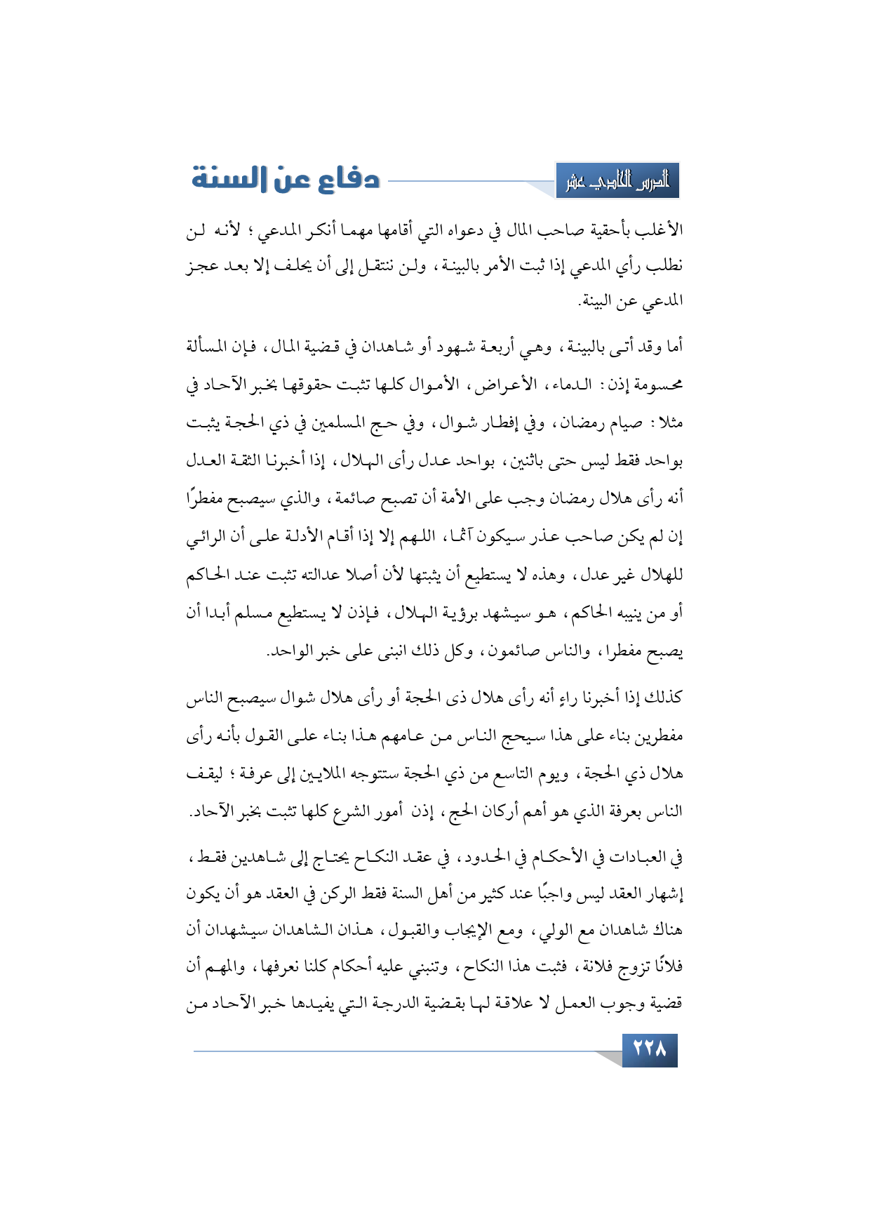 أما وقد أتى بالبينة، وهي أربعة شهود أو شاهدان في قضية المال، فإن المسألة محسومة إذن: الدماء، الأعراض، الأموال كلها تثبت حقوقها بخبر الآحاد في مثلا: صيام رمضان، وفي إفطار شوال، وفي حج المسلمين في ذي الحجة يثبت بواحد فقط ليس حتى باثنين، بواحد عدل رأى الهلال، إذا أخبرنا الثقة العدل أنه رأى هلال رمضان وجب على الأمة أن تصبح صائمة، والذي سيصبح مفطرًا إن لم يكن صاحب عذر سيكون آثما، اللهم إلا إذا أقام الأدلة على أن الرائي للهلال غير عدل، وهذه لا يستطيع أن يثبتها لأن أصلا عدالته تثبت عند الحاكم أو من ينيبه الحاكم، هو سيشهد برؤية الهلال، فإذن لا يستطيع مسلم أبدا أن يصبح مفطرا، والناس صائمون، وكل ذلك انبنى على خبر الواحد.
