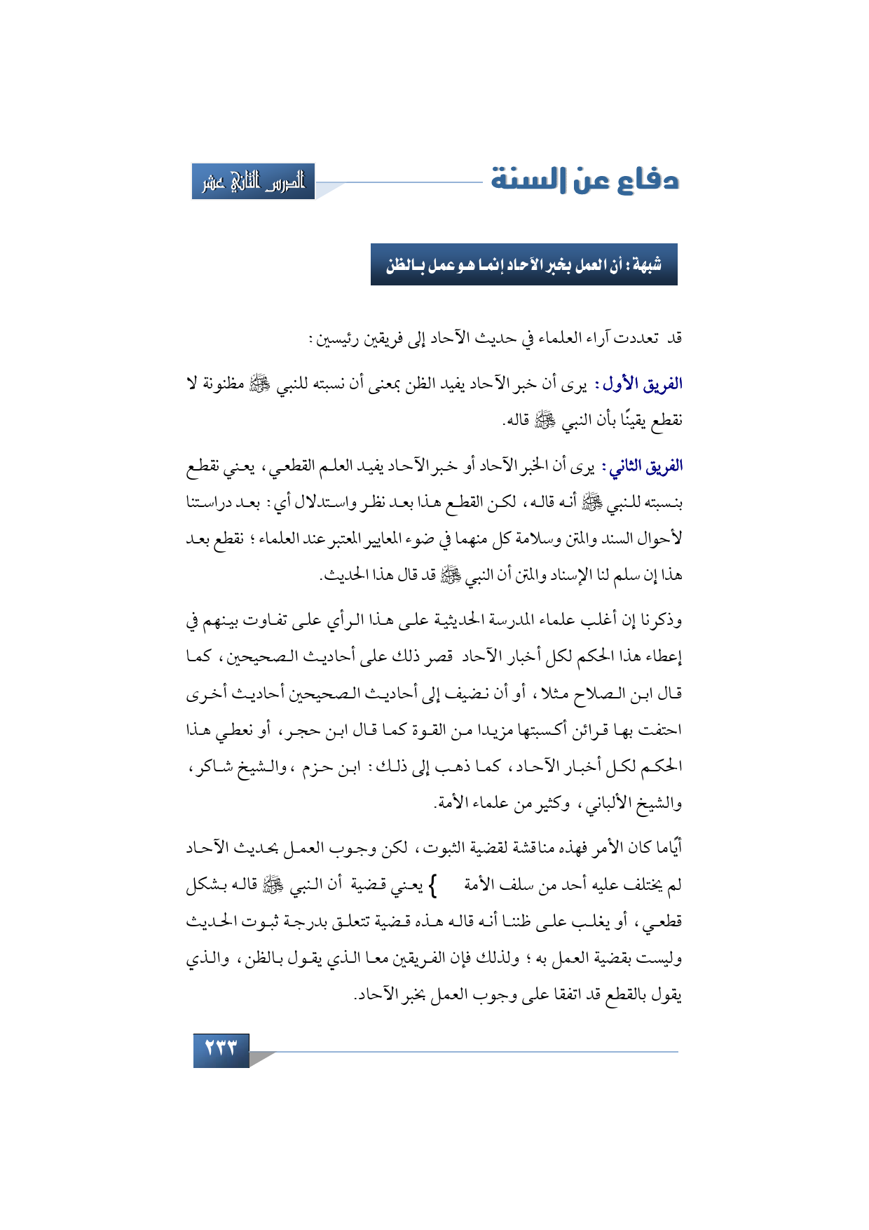 أيًاما كان الأمر فهذه مناقشة لقضية الثبوت، لكن الوجوب العمل بحديث الآحاد لم يختلف عليه أحد من سلف الأمة -رضي الله عنهم أجمعين- يعني قضية أن النبي -صلى الله عليه وسلم- يعني قاله بشكل قطعي، أو يغلب على ظننا أنه قاله هذه قضية تتعلق بدرجة ثبوت الحديث وليست بقضية العمل به؛ ولذلك فإن الفريقين معا الذي يقول بالظن، والذي يقول بالقطع قد اتفقا على وجوب العمل بخبر الآحاد.