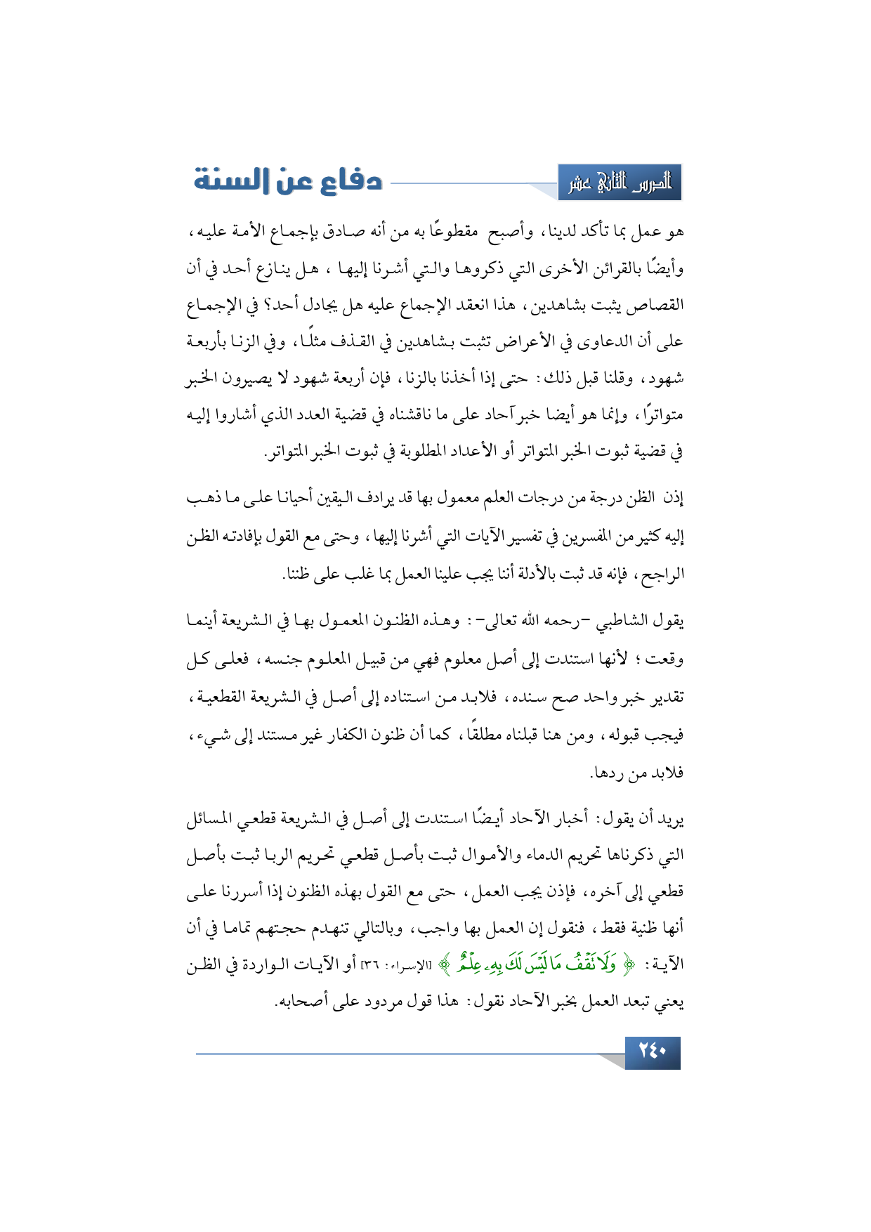 يعني يريد أن يقول: أخبار الآحاد أيضًا استندت إلى أصل في الشريعة قطعي المسائل التي ذكرناها تحريم الدماء والأموال ثبت بأصل قطعي تحريم الربا ثبت بأصل قطعي إلى آخره، فإذن يجب العمل، حتى مع القول بهذه الظنون إذا يعني أسررنا على أنها ظنية فقط، فنقول إن العمل بها واجب، وبالتالي تنهدم حجتهم تماما في أن الآية: {وَلَا تَقْفُ مَا لَيْسَ لَكَ بِهِ عِلْمٌ} (الإسراء: 36) أو الآيات الواردة في الظن يعني تبعد العمل بخبر الآحاد نقول: هذا قول مردود على أصحابه.