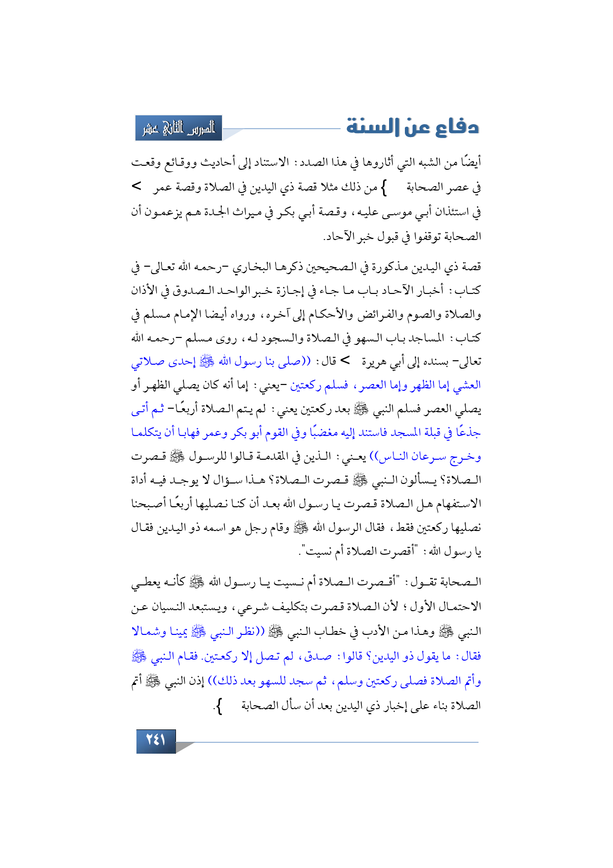 قصة ذي اليدين مذكورة في الصحيحين ذكرها البخاري -رحمه الله تعالى- في كتاب: أخبار الآحاد باب ما جاء في إجازة خبر الواحد الصدوق في الأذان والصلاة والصوم والفرائض والأحكام إلى آخره، ورواه أيضا الإمام مسلم في كتاب: المساجد باب السهو في الصلاة والسجود له، روى مسلم -رحمه الله تعالى- بسنده إلى أبي هريرة -رضي الله تعالى عنه- قال: ((صلى بنا رسول الله -صلى الله عليه وسلم- إحدى صلاتي العشي إما الظهر وإما العصر، فسلم ركعتين -يعني: إما أنه كان يصلي الظهر أو يصلي العصر فسلم النبي -صلى الله عليه وسلم- بعد ركعتين يعني: لم يتم الصلاة أربعًا- ثم أتى جذعًا في قبلة المسجد فاستند إليه مغضبًا وفي القوم أبو بكر وعمر فهابا أن يتكلما وخرج سرعان الناس)) يعني: الذين في المقدمة قالوا للرسول -صلى الله عليه وسلم- قصرت الصلاة؟ يسألون النبي -صلى الله عليه وسلم- قصرت الصلاة؟ هذا سؤال لا يوجد فيه أداة الاستفهام هل الصلاة قصرت يا رسول الله بعد أن كنا نصليها أربعًا أصبحنا نصليها ركعتين فقط، فقال الرسول الله -صلى الله عليه وسلم- وقام رجل هو اسمه ذو اليدين فقال يا رسول الله: "أقصرت الصلاة أم نسيت".