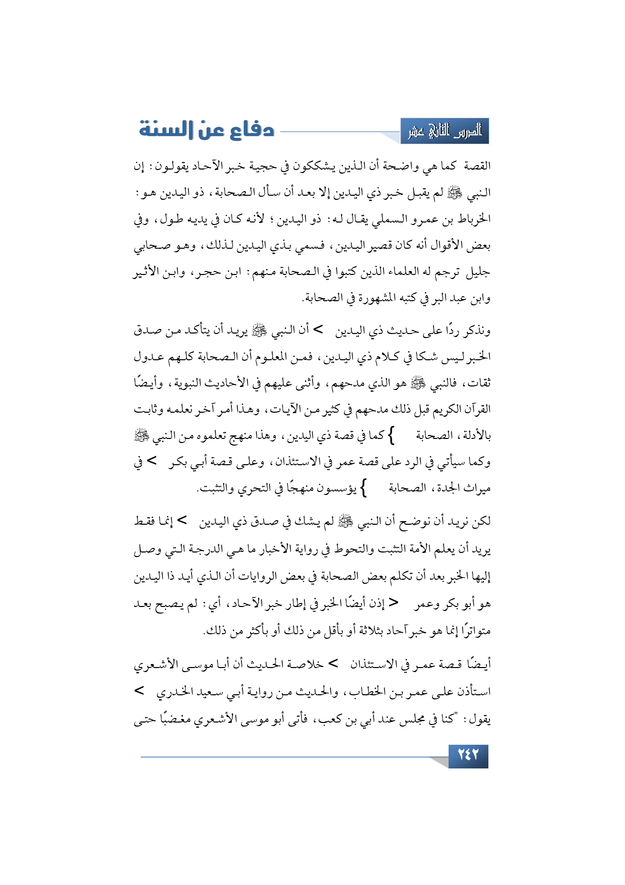 لكن نريد أن نوضح أن النبي -صلى الله عليه وسلم- لم يشك في صدق ذي اليدين -رضي الله تعالى عنه- إنما فقط يريد أن يعلم الأمة التثبت والتحوط في رواية الأخبار ما هي الدرجة التي وصل إليها الخبر بعد أن تكلم بعض الصحابة في بعض الروايات أن الذي أيد ذا اليدين هو أبو بكر وعمر -رضي الله تعالى عنهما- إذن أيضًا الخبر في إطار خبر الآحاد، يعني: لم يصبح بعد متواترًا إنما هو خبر آحاد بثلاثة أو بأقل من ذلك أو بأكثر من ذلك.