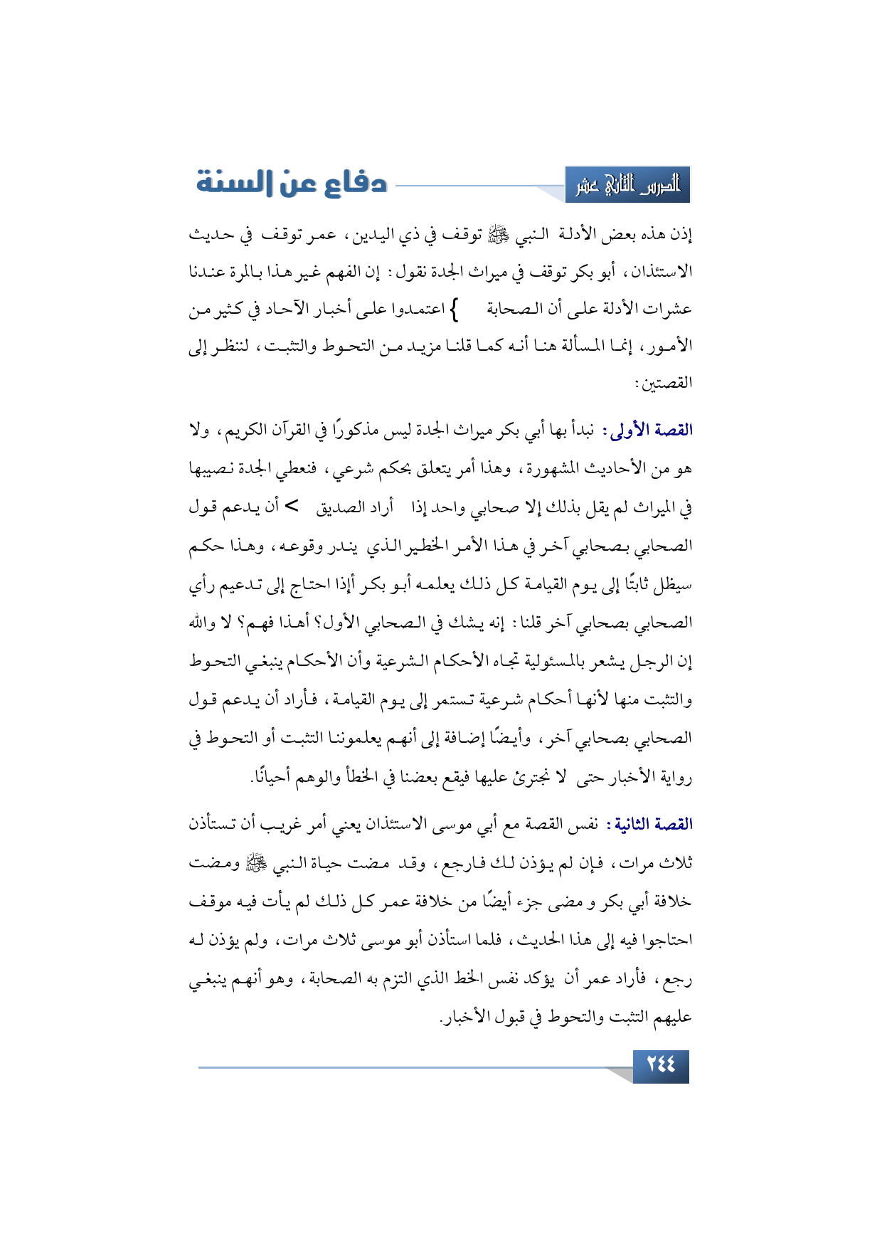 القصة الأولى: نبدأ بها أبي بكر ميراث الجدة ليس مذكورًا في القرآن الكريم، ولا هو من الأحاديث المشهورة, وهذا أمر يتعلق بحكم شرعي, فنعطي الجدة نصيبها في الميراث لم يقل بذلك إلا صحابي واحد إذا أراد الصديق -رضي الله عنه- أن يدعم قول الصحابي بصحابي آخر في هذا الأمر الخطير الذي يندر وقوعه، وهذا حكم سيظل ثابتًا إلى يوم القيامة كل ذلك يعلمه أبو بكر أإذا احتاج إلى تدعيم رأي الصحابي بصحابي آخر قلنا: إنه يشك في الصحابي الأول؟ أهذا فهم؟ لا والله إن الرجل يشعر بالمسئولية تجاه الأحكام الشرعية وأن الأحكام ينبغي التحوط والتثبت منها لأنها أحكام شرعية تستمر إلى يوم القيامة، فأراد أن يدعم قول الصحابي بصحابي آخر، وأيضًا إضافة إلى أنهم يعلموننا التثبت أو التحوط في رواية الأخبار حتى لا نجترئ عليها فيقع بعضنا في الخطأ والوهم أحيانًا.