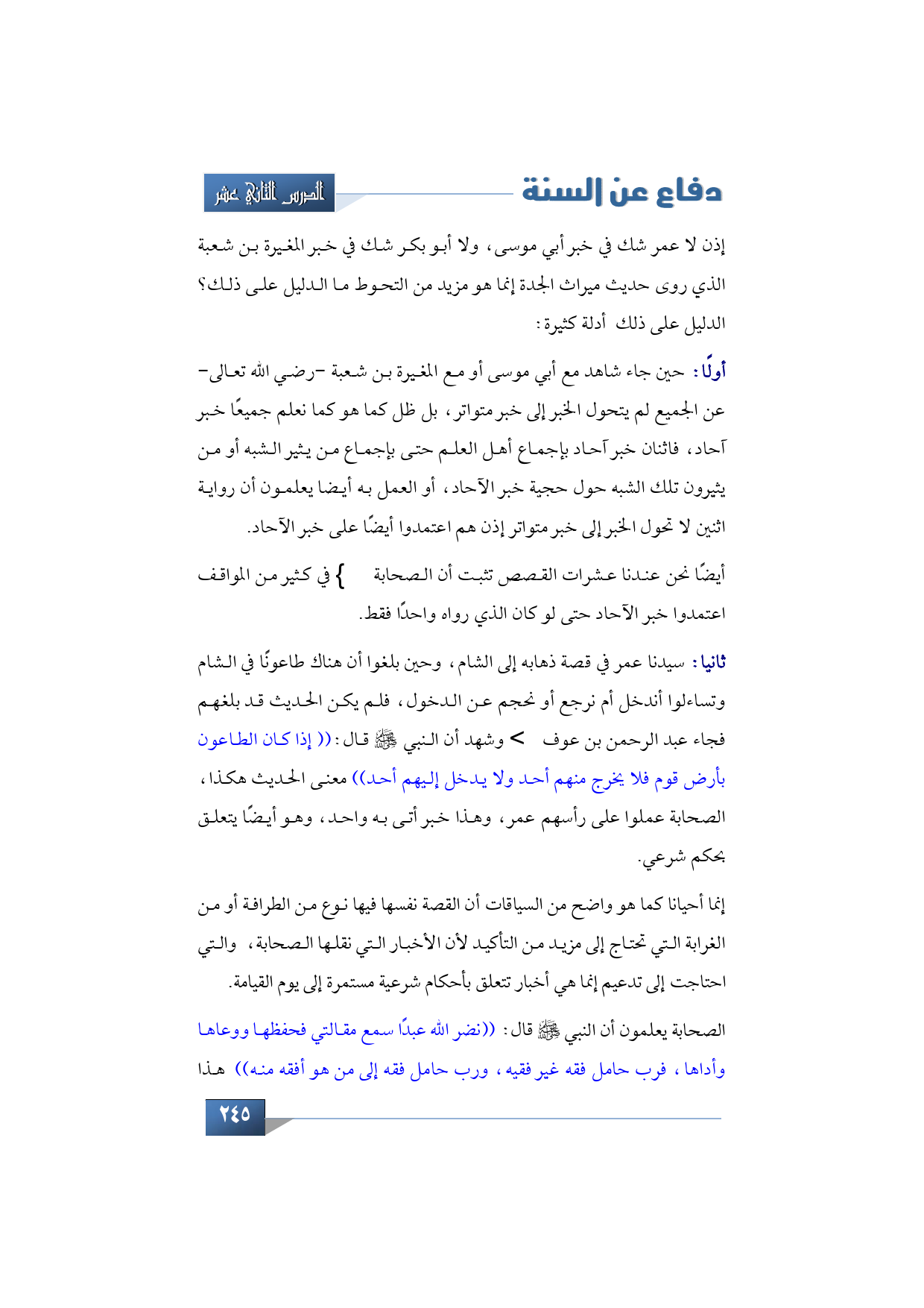 عندنا مثلا يعني عمر في قصة ذهابه إلى الشام، وحين بلغوا أن هناك طاعونًا في الشام وتساءلوا أندخل أم نرجع أو نحجم عن الدخول، فلم يكن الحديث قد بلغهم فجاء عبد الرحمن بن عوف رضي الله عنه وشهد أن النبي -صلى الله عليه وسلم- قال: ((إذا كان الطاعون بأرض قوم فلا يخرج منهم أحد ولا يدخل إليهم أحد)) معنى الحديث هكذا، الصحابة عملوا على رأسهم عمر، وهذا خبر أتى به واحد، وهو أيضًا يتعلق بحكم شرعي.