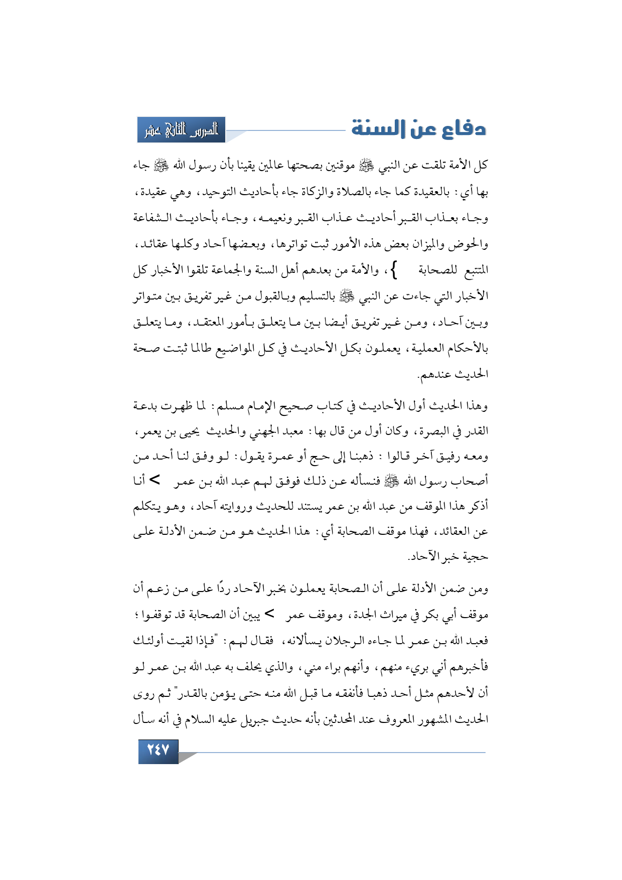وهذا الحديث أول الأحاديث في كتاب صحيح الإمام مسلم: لما ظهرت بدعة القدر في البصرة، وكان أول من قال بها: معبد الجهني والحديث يحيى بن يعمر، ومعه رفيق آخر قالوا: ذهبنا إلى حج أو عمرة يقول: لو وفق لنا أحد من أصحاب رسول الله -صلى الله عليه وسلم- فنسأله عن ذلك فوفق لهم عبد الله بن عمر رضي الله تعالى عنه- أنا أذكر هذا الموقف من عبد الله بن عمر يستند للحديث وروايته آحاد، وهو يتكلم عن العقائد، فهذا موقف الصحابة يعني هذا الحديث هو من ضمن الأدلة على حجية خبر الآحاد.