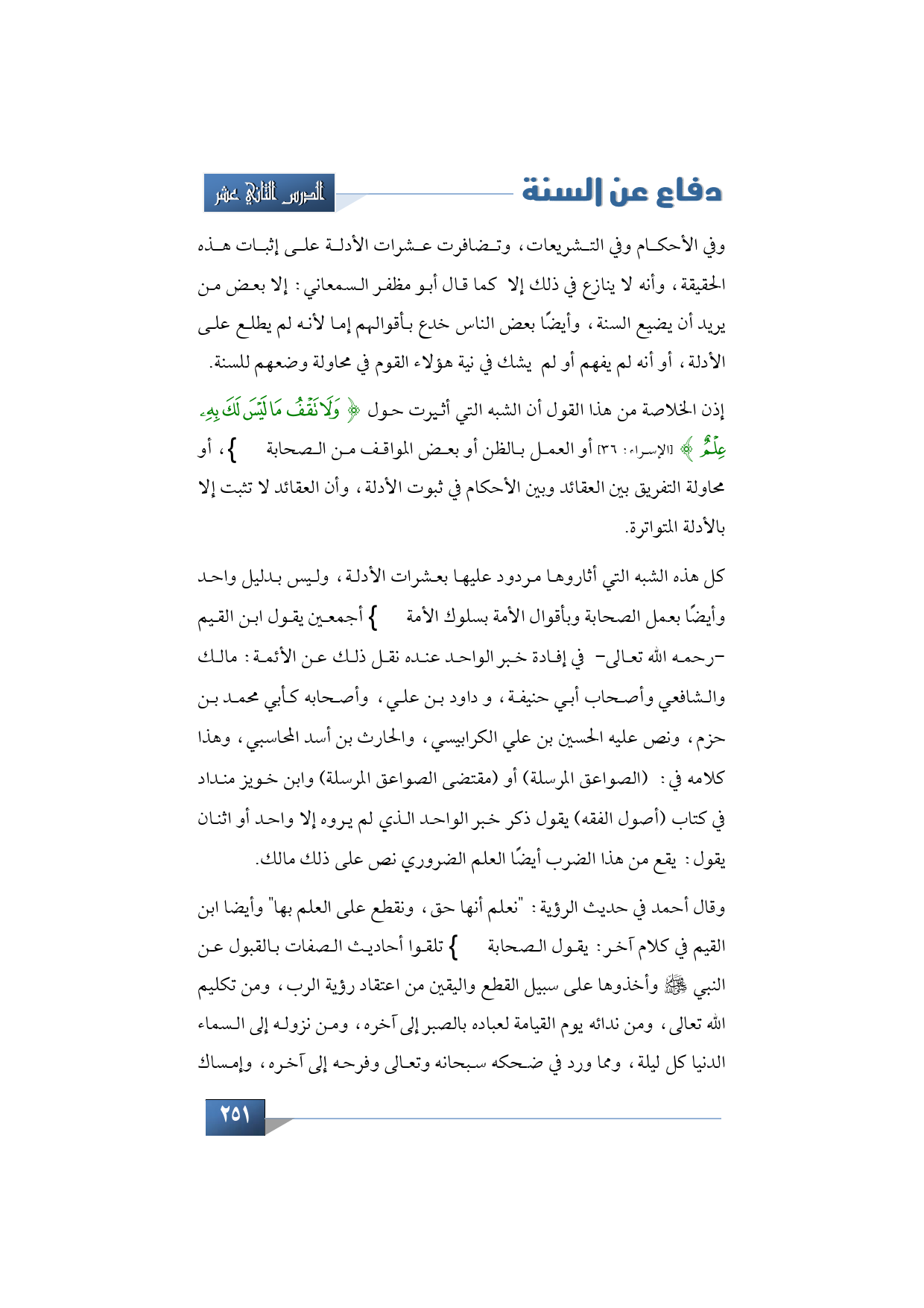 إذن الخلاصة من هذا القول أن الشبه التي أثيرت حول {وَلَا تَقْفُ مَا لَيْسَ لَكَ بِهِ عِلْمٌ} (الإسراء: 36) أو العمل بالظن أو بعض المواقف من الصحابة رضي الله عنهم، أو محاولة التفريق بين العقائد وبين الأحكام في ثبوت الأدلة، وأن العقائد لا تثبت إلا بالأدلة المتواترة.