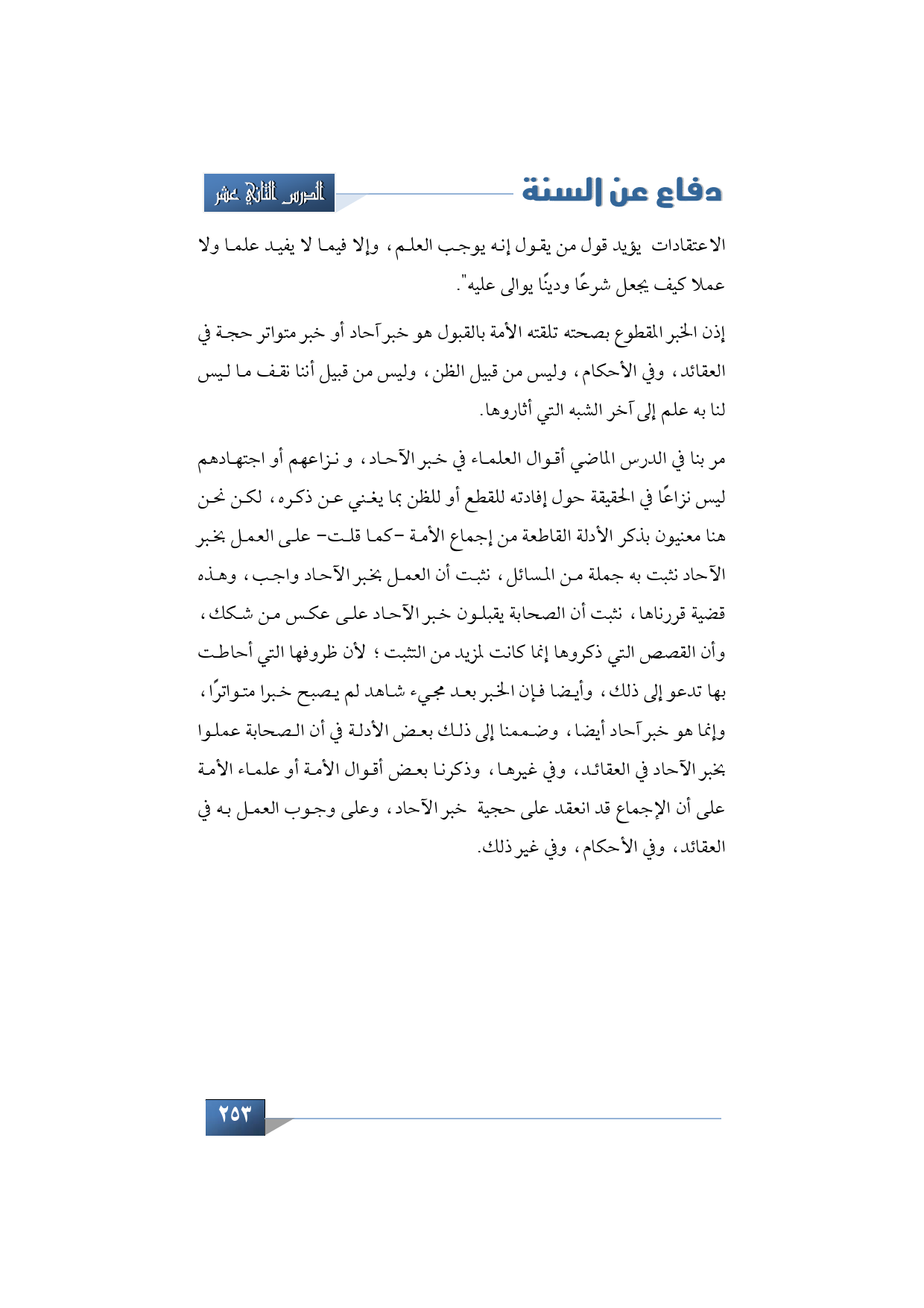 مر بنا في الدرس الماضي أقوال العلماء في خبر الآحاد، ونزاعهم أو اجتهادهم ليس نزاعًا في الحقيقة حول إفادته للقطع أو للظن بما يغني عن ذكره، لكن نحن هنا معنيون بذكر الأدلة القاطعة من إجماع الأمة -كما قلت- على العمل بخبر الآحاد نثبت به جملة من المسائل، نثبت أن العمل بخبر الآحاد واجب، وهذه قضية قررناها، نثبت أن الصحابة يقبلون خبر الآحاد على عكس من شكك، وأن القصص التي ذكروها إنما كانت لمزيد من التثبت؛ لأن ظروفها التي أحاطت بها تدعو إلى ذلك، وأيضا فإن الخبر بعد مجيء شاهد لم يصبح خبرا متواترًا، وإنما هو خبر آحاد أيضا، وضممنا إلى ذلك بعض الأدلة في أن الصحابة عملوا بخبر الآحاد في العقائد، وفي غيرها، وذكرنا بعض أقوال الأمة أو علماء الأمة على أن الإجماع قد انعقد على حجية خبر الآحاد، وعلى وجوب العمل به في العقائد، وفي الأحكام، وفي غير ذلك هذا وبالله التوفيق.