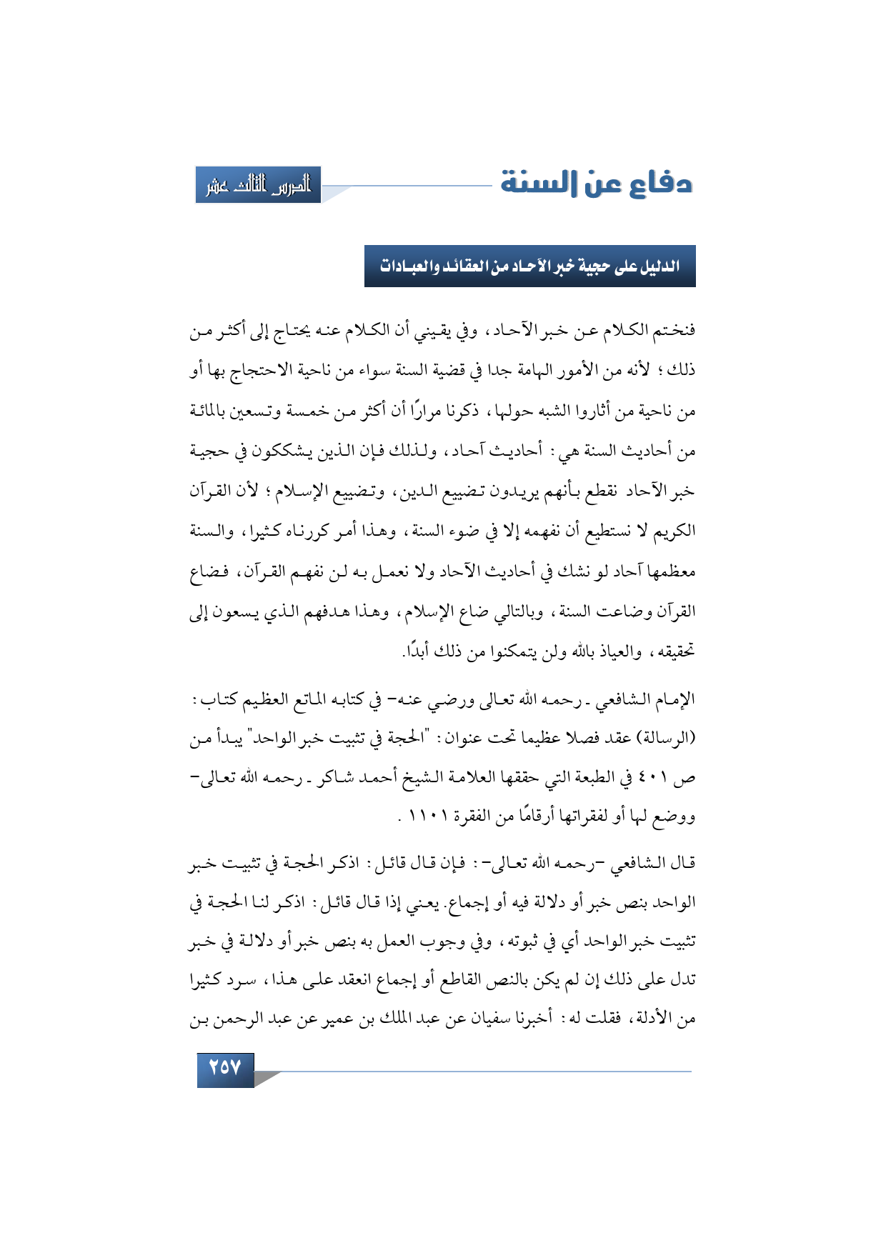 الإمام الشافعي ـ رحمه الله تعالى ورضي عنه- في كتابه الماتع العظيم كتاب: (الرسالة) عقد فصلا عظيما تحت عنوان: "الحجة في تثبيت خبر الواحد" يبدأ من ص 401 في الطبعة التي حققها العلامة الشيخ أحمد شاكر ـ رحمه الله تعالى- ووضع لها أو لفقراتها أرقامًا من الفقرة 1101.
