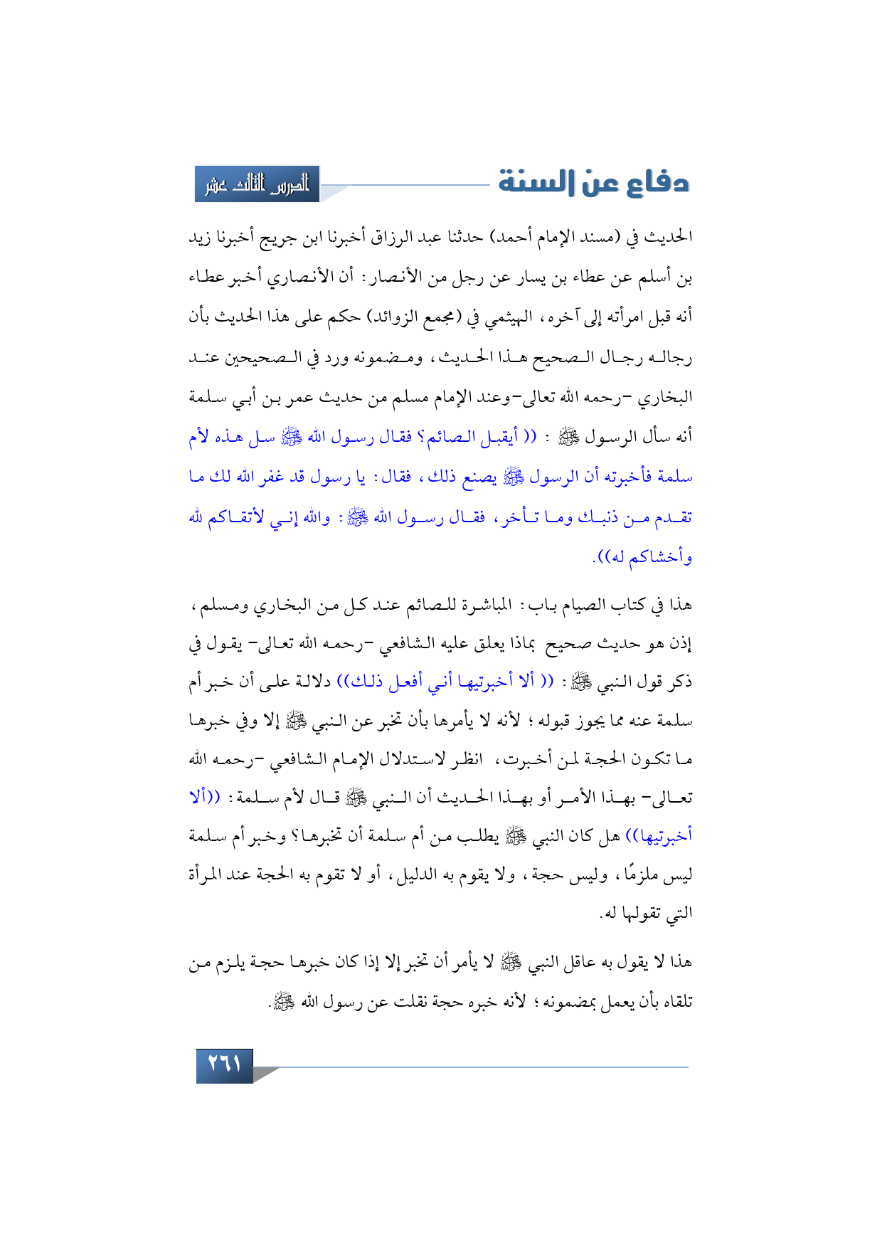 هذا في كتاب الصيام باب: المباشرة للصائم عند كل من البخاري ومسلم، إذن هو حديث صحيح بماذا يعلق عليه الشافعي -رحمه الله تعالى- يقول في ذكر قول النبي -صلى الله عليه وسلم-: ((ألا أخبرتيها أني أفعل ذلك)) دلالة على أن خبر أم سلمة عنه مما يجوز قبوله؛ لأنه لا يأمرها بأن تخبر عن النبي -صلى الله عليه وسلم- إلا وفي خبرها ما تكون الحجة لمن أخبرت، انظر لاستدلال الإمام الشافعي -رحمه الله تعالى- بهذا الأمر أو بهذا الحديث أن النبي -صلى الله عليه وسلم- قال لأم سلم: ((ألا أخبرتيها)) هل كان النبي -صلى الله عليه وسلم- يطلب من أم سلمة أن تخبرها؟ وخبر أم سلمة ليس ملزما، وليس حجة، ولا يقوم به الدليل، أو لا تقوم به الحجة عند المرأة التي تقولها له.