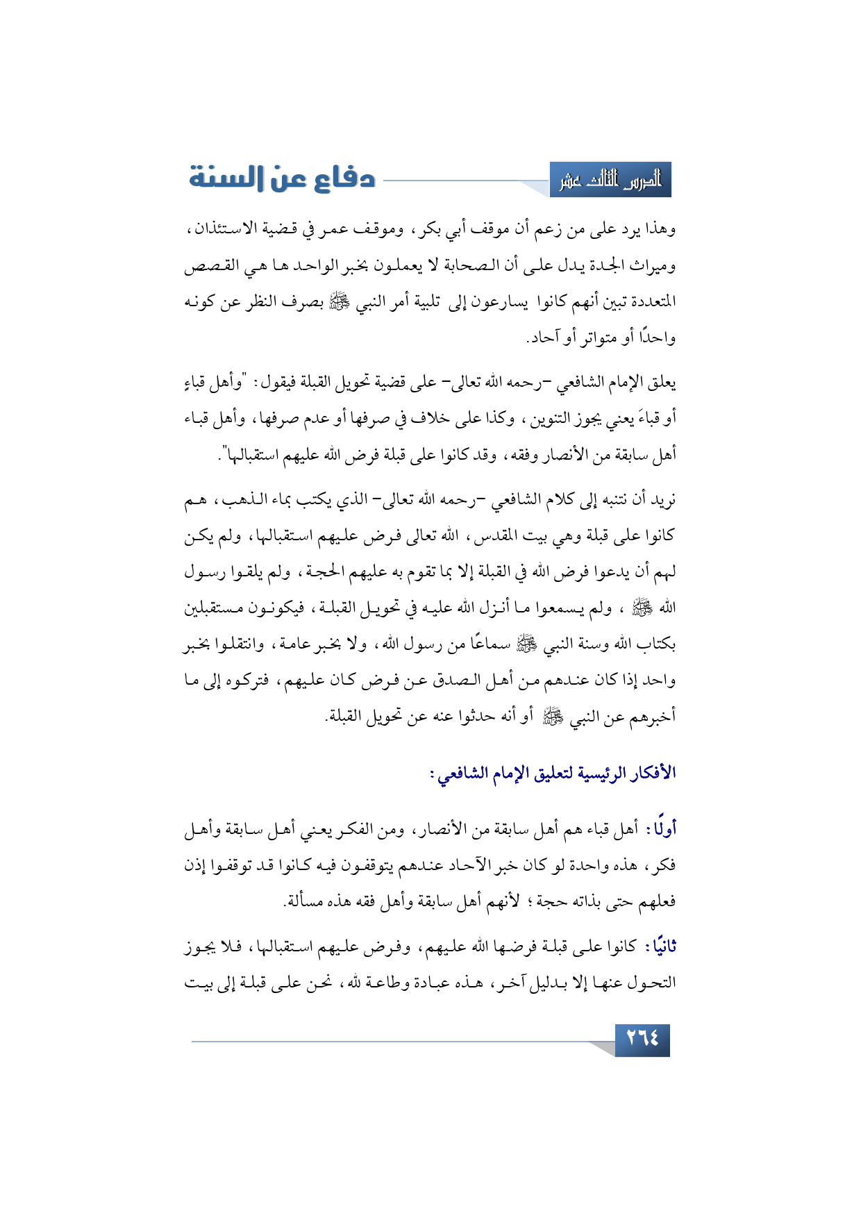 كلام الشافعي أفكاره الرئيسة كالآتي: أهل قباء هم أهل سابقة من الأنصار، ومن الفكر يعني أهل سابقة وأهل فكر، هذه واحدة لو كان خبر الآحاد عندهم يتوقفون فيه كانوا قد توقفوا إذن فعلهم حتى بذاته حجة؛ لأنهم أهل سابقة وأهل فقه هذه مسألة.