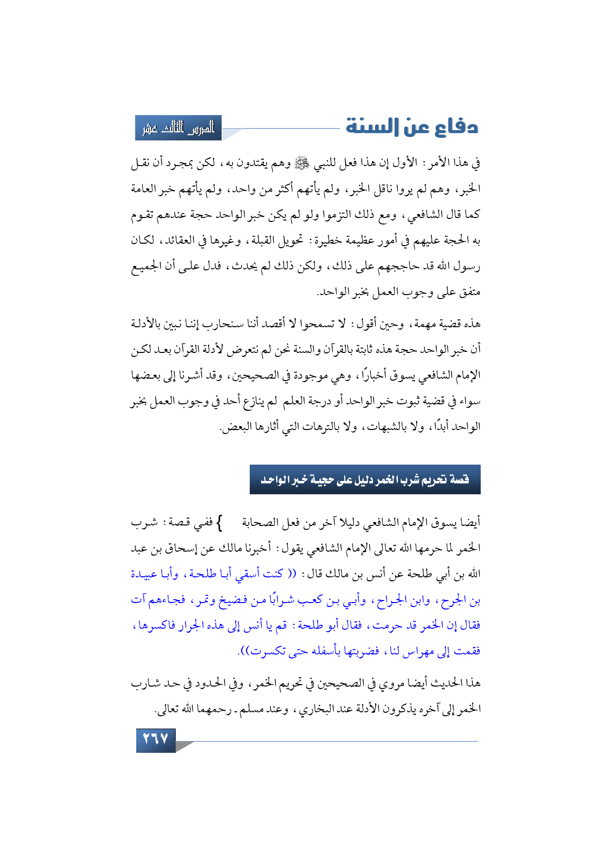هذه قضية مهمة، ولا ينبغي لكم أن تسمحوا أبدًا ـ نحن لا نقاتل بالسيوف نقاتل بالعلم بالأدلة ـ حين أقول: لا تسمحوا لا أقصد أننا سنحارب إننا نبين بالأدلة أن خبر الواحد حجة هذه قضية ثابتة بالقرآن والسنة نحن لم نتعرض لأدلة القرآن بعد لكن الإمام الشافعي يسوق أخبارًا، وهي موجودة في الصحيحين وأمامي الآن، وأنا أقرأ عشرات النقول من علماء الأمة، وقد أشرنا إلى بعضها سواء في قضية ثبوت خبر الواحد أو درجة العلم لم ينازع أحد في وجوب العمل بخبر الواحد أبدًا، ولا بالشبهات، ولا بالترهات التي أثارها البعض.