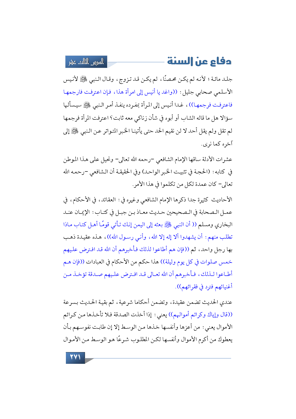 جلد مائة؛ لأنه لم يكن محصنًا، لم يكن قد تزوج، وقال النبي -صلى الله عليه وسلم- لأنيس الأسلمي صحابي جليل: ((واغد يا أنيس إلى امرأة هذا، فإن اعترفت فارجمها فاعترفت فرجمها))، غدا أنيس إلى المرأة بمفرده ينفذ أمر النبي -صلى الله عليه وسلم- سيسألها سؤالا هل ما قاله الشاب أو أبوه في شأن زناكي معه ثابت؟ اعترفت المرأة فرجمها لم تقل ولم يقل أحد لا لن نقيم الحد حتى يأتينا الخبر المتواتر عن النبي -صلى الله عليه وسلم- إلى آخره كما نرى.