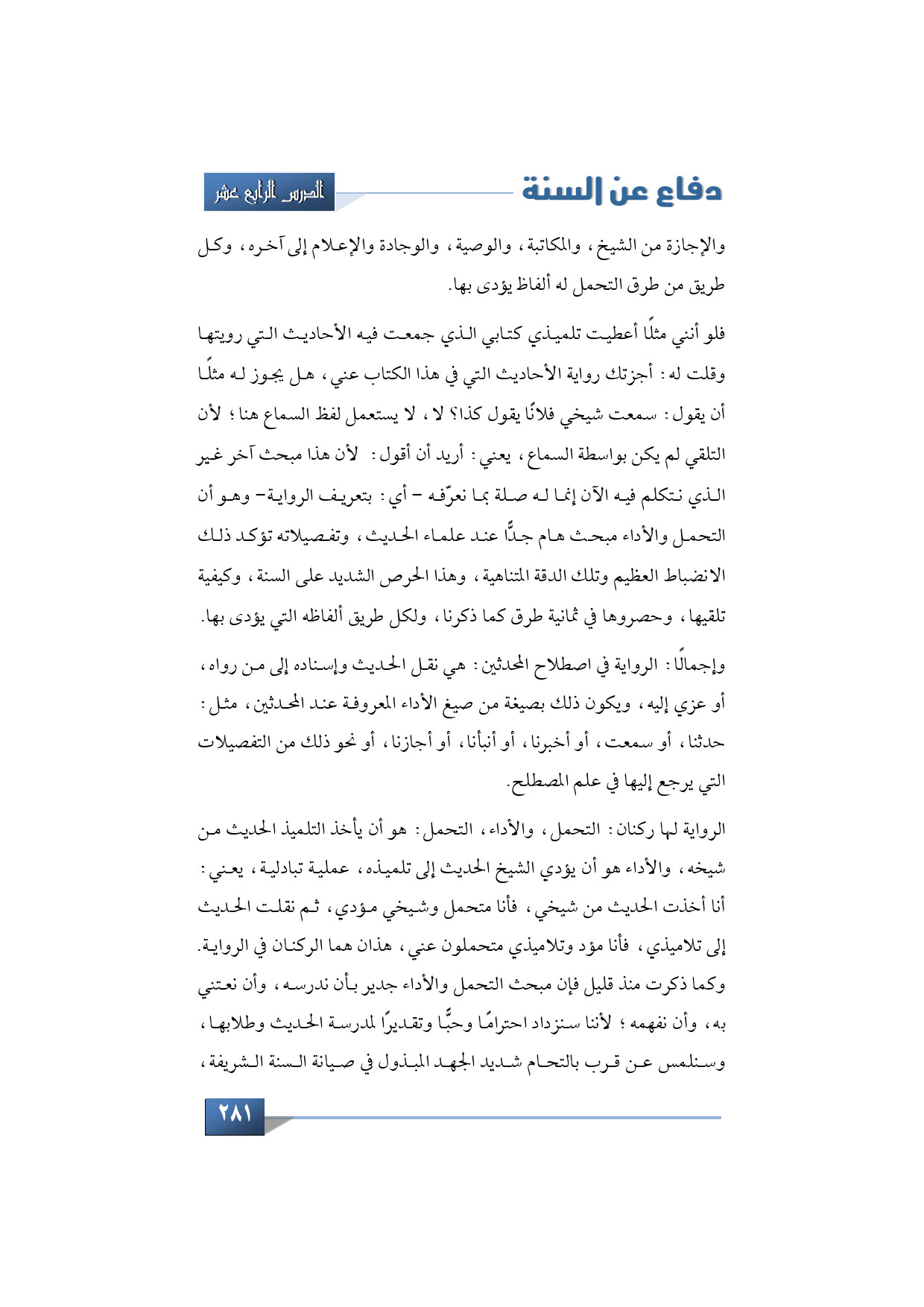 الرواية لها ركنان: التحمل، والأداء، التحمل: هو أن يأخذ التلميذ الحديث من شيخه، والأداء هو أن يؤدي الشيخ الحديث إلى تلميذه، يعني: عملية تبادلية، يعني: أنا أخذت الحديث من شيخي، فأنا متحمل وشيخي مؤدي، ثم نقلت الحديث إلى تلاميذي فأنا مؤد وتلاميذي متحملون عني، هذان هما الركنان في الرواية. وكما ذكرت منذ قليل فإن مبحث التحمل والأداء جدير بأن ندرسه، وأن نعتني به، وأن نفهمه؛ لأننا سنزداد احترامًا وحبًّا وتقديرًا لمدرسة الحديث وطلابها، وسنلمس عن قرب بالتحام شديد الجهد المبذول في صيانة السنة الشريفة،