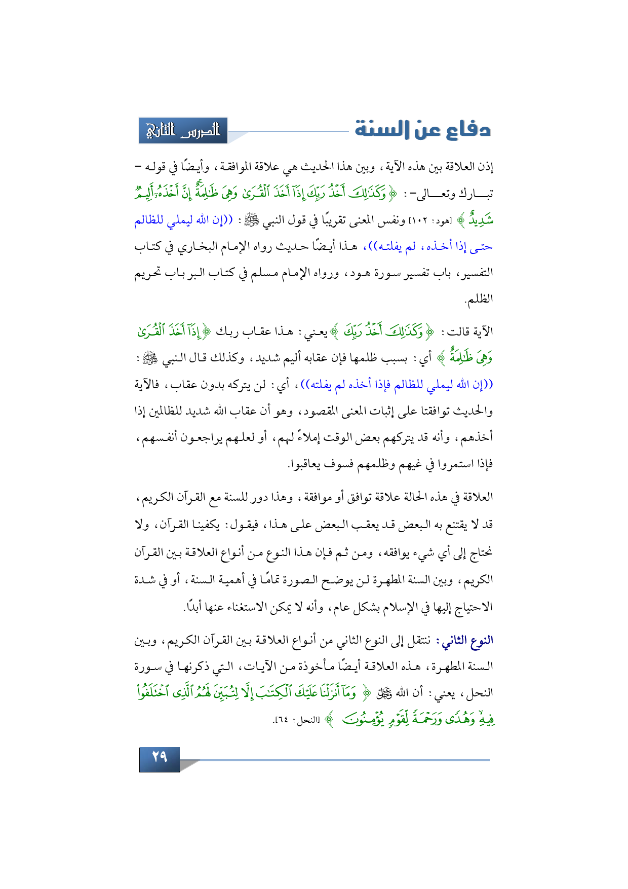 إذن العلاقة بين هذه الآية، وبين هذا الحديث هي علاقة الموافقة، وأيضًا في قوله -تبارك وتعالى-: {وَكَذَلِكَ أَخْذُ رَبِّكَ إِذَا أَخَذَ الْقُرَى وَهِيَ ظَالِمَةٌ إِنَّ أَخْذَهُ أَلِيمٌ شَدِيدٌ} (هود: 102) ونفس المعنى تقريبًا في قول النبي -صلى الله عليه وسلم-: ((إن الله ليملي للظالم حتى إذا أخذه، لم يفلته))، هذا أيضًا حديث رواه الإمام البخاري في كتاب التفسير، باب تفسير سورة هود، ورواه الإمام مسلم في كتاب البر باب تحريم الظلم.