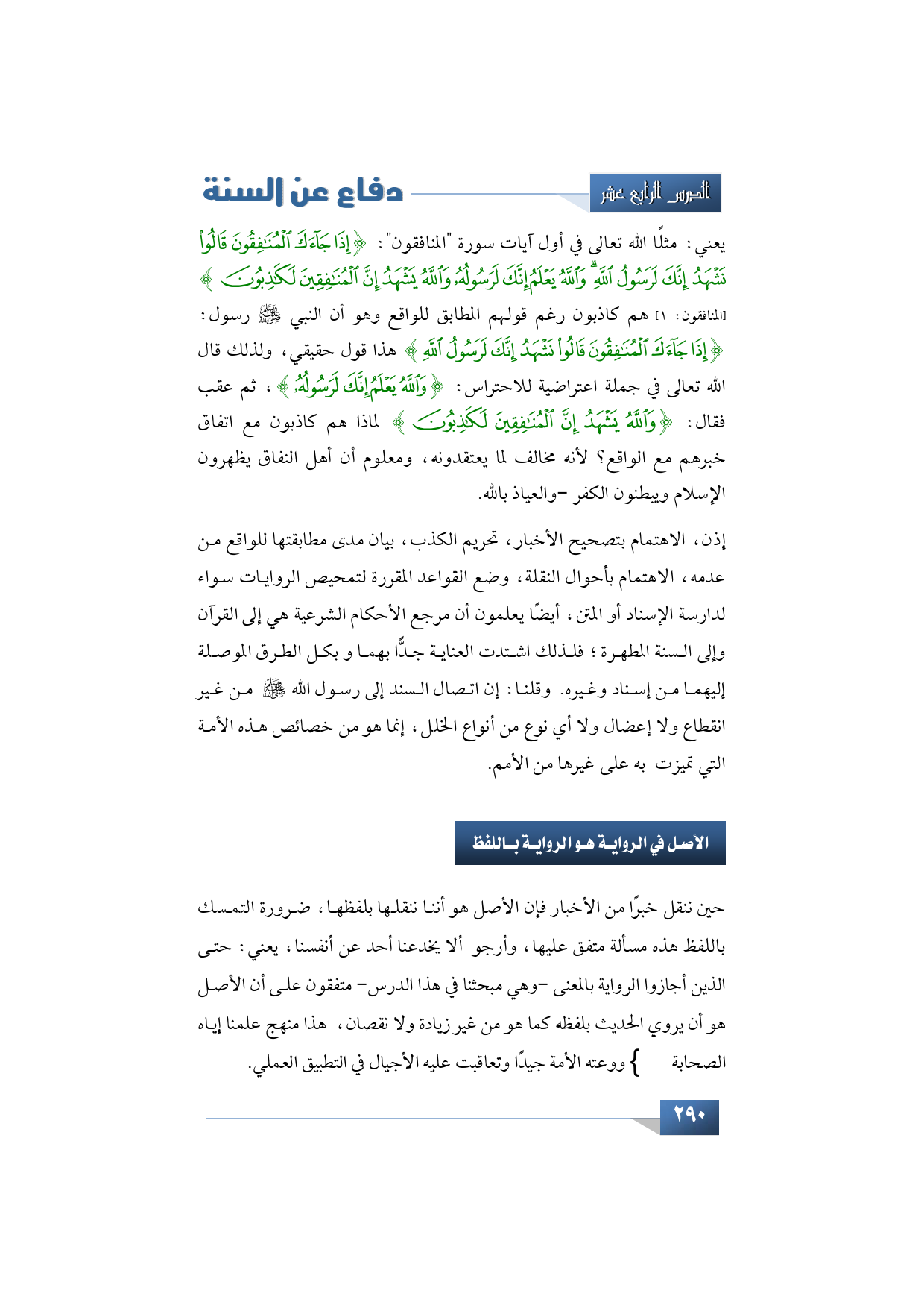 يعني: مثلًا الله تعالى في أول آيات سورة "المنافقون": {إِذَا جَاءكَ الْمُنَافِقُونَ قَالُوا نَشْهَدُ إِنَّكَ لَرَسُولُ اللَّهِ وَاللَّهُ يَعْلَمُ إِنَّكَ لَرَسُولُهُ وَاللَّهُ يَشْهَدُ إِنَّ الْمُنَافِقِينَ لَكَاذِبُون} (المنافقون: 1) هم كاذبون رغم قولهم المطابق للواقع وهو أن النبي -صلى الله عليه وسلم- رسول: {إِذَا جَاءكَ الْمُنَافِقُونَ قَالُوا نَشْهَدُ إِنَّكَ لَرَسُولُ اللَّهِ} هذا قول حقيقي، ولذلك قال الله تعالى في جملة اعتراضية للاحتراس: {وَاللَّهُ يَعْلَمُ إِنَّكَ لَرَسُولُهُ}، ثم عقب فقال: {وَاللَّهُ يَشْهَدُ إِنَّ الْمُنَافِقِينَ لَكَاذِبُون} لماذا هم كاذبون مع اتفاق خبرهم مع الواقع؟ لأنه مخالف لما يعتقدونه، ومعلوم أن أهل النفاق يظهرون الإسلام ويبطنون الكفر -والعياذ بالله-.