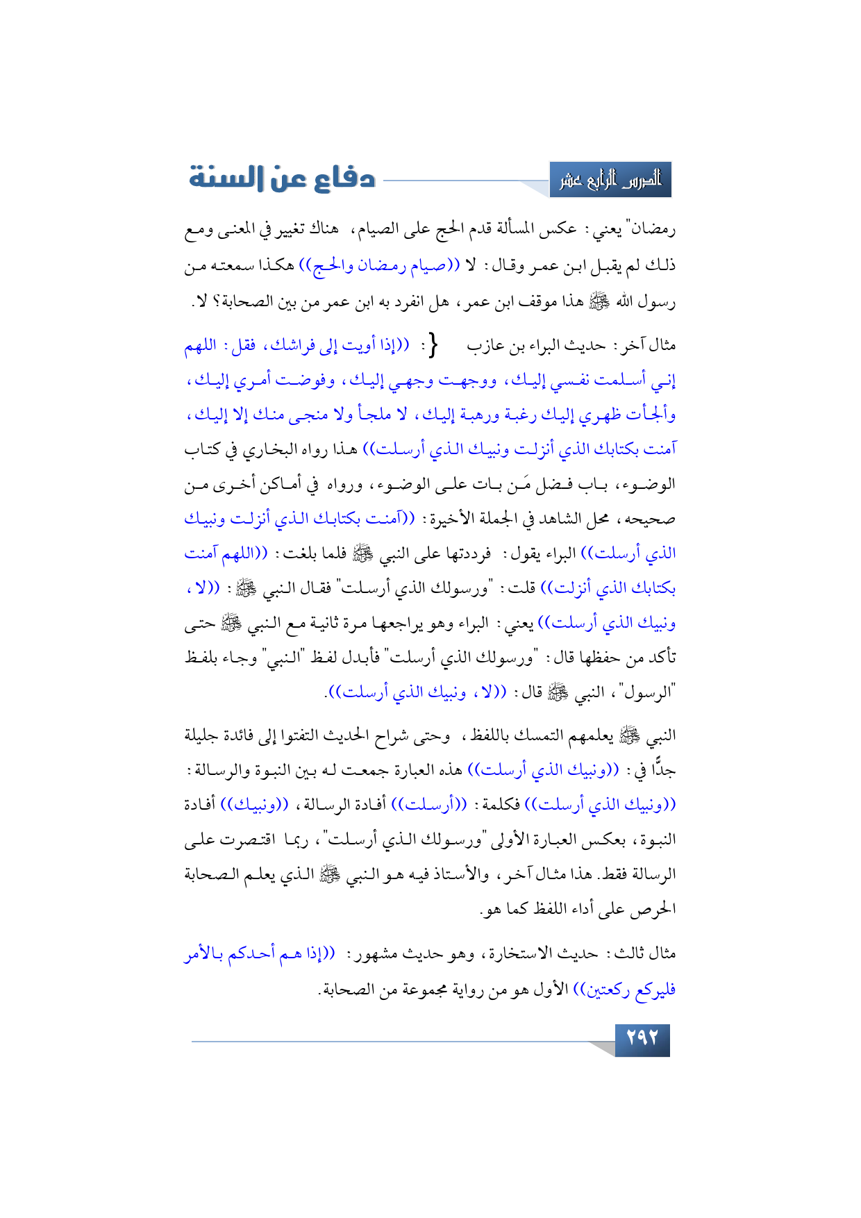 مثال آخر: حديث البراء بن عازب -رضي الله تعالى عنهما-: ((إذا أويت إلى فراشك، فقل: اللهم إني أسلمت نفسي إليك، ووجهت وجهي إليك، وفوضت أمري إليك، وألجأت ظهري إليك رغبة ورهبة إليك، لا ملجأ ولا منجى منك إلا إليك، آمنت بكتابك الذي أنزلت ونبيك الذي أرسلت)) هذا رواه البخاري في كتاب الوضوء، باب فضل مَن بات على الوضوء، ورواه في أماكن أخرى من صحيحه، محل الشاهد في الجملة الأخيرة: ((آمنت بكتابك الذي أنزلت ونبيك الذي أرسلت)) البراء يقول: فرددتها على النبي -صلى الله عليه وسلم- فلما بلغت: ((اللهم آمنت بكتابك الذي أنزلت)) قلت: "ورسولك الذي أرسلت" فقال النبي -صلى الله عليه وسلم-: ((لا، ونبيك الذي أرسلت)) يعني: البراء وهو يراجعها مرة ثانية مع النبي -صلى الله عليه وسلم- حتى تأكد من حفظها قال: "ورسولك الذي أرسلت" فأبدل لفظ "النبي" وجاء بلفظ "الرسول"، النبي -صلى الله عليه وسلم- قال: ((لا، ونبيك الذي أرسلت)).