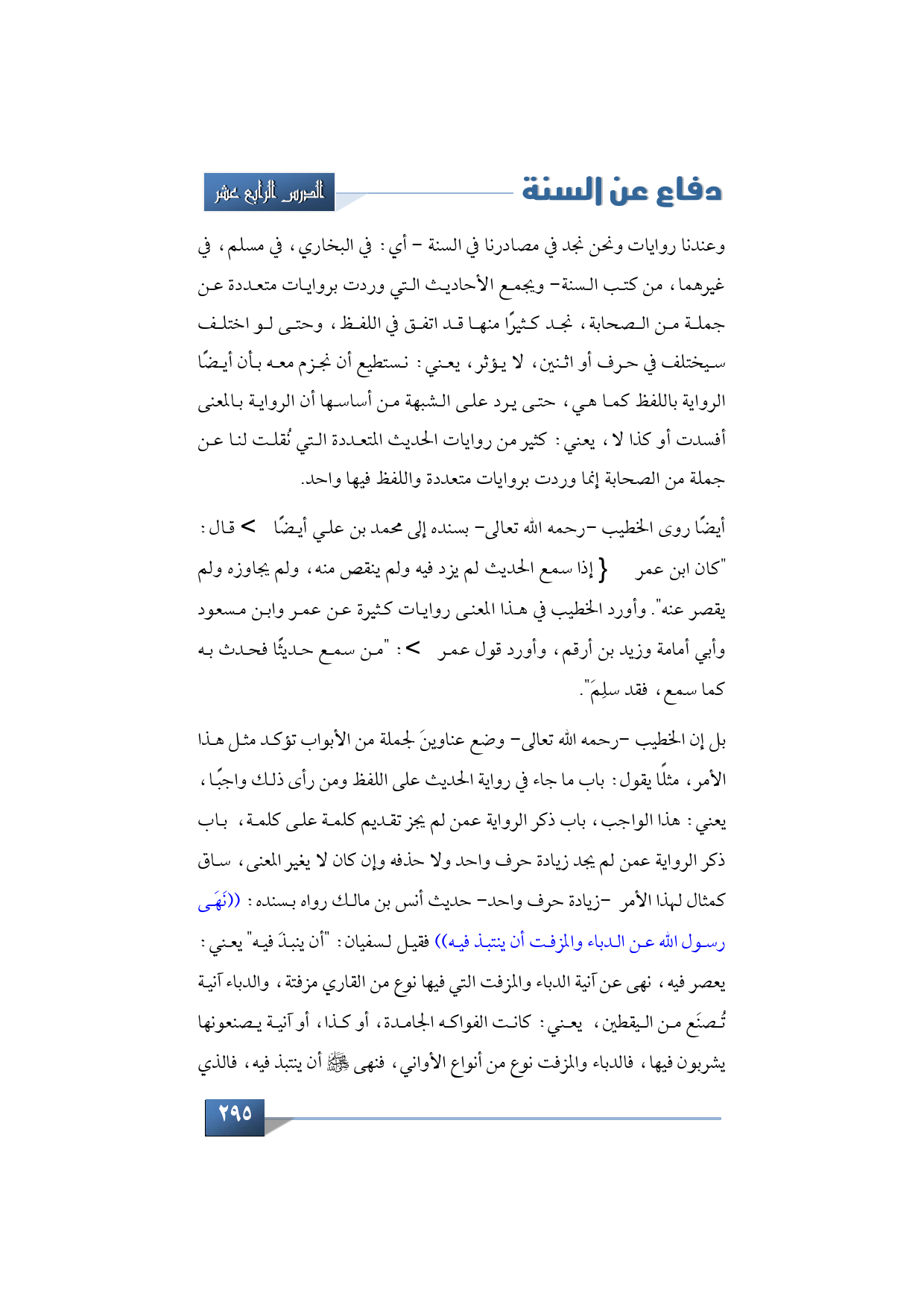 بل إن الخطيب -رحمه الله تعالى- وضع عناوينَ لجملة من الأبواب تؤكد مثل هذا الأمر، مثلًا يقول: باب ما جاء في رواية الحديث على اللفظ ومن رأى ذلك واجبًا، يعني: هذا الواجب، باب ذكر الرواية عمن لم يجز تقديم كلمة على كلمة، باب ذكر الرواية عمن لم يجد زيادة حرف واحد ولا حذفه وإن كان لا يغير المعنى، ساق كمثال لهذا الأمر -زيادة حرف واحد- حديث أنس بن مالك رواه بسنده: ((نَهَى رسول الله عن الدباء والمزفت أن ينتبذ فيه)) فقيل لسفيان: "أن ينبذَ فيه" يعني: يعصر فيه، نهى عن آنية الدباء والمزفت التي فيها نوع من القاري مزفتة، والدباء آنية تُصنَع من اليقطين، يعني: كانت الفواكه الجامدة، أو كذا، أو آنية يصنعونها يشربون فيها، فالدباء والمزفت نوع من أنواع الأواني فنهى -صلى الله عليه وسلم- أن ينتبذ فيه، فالذي