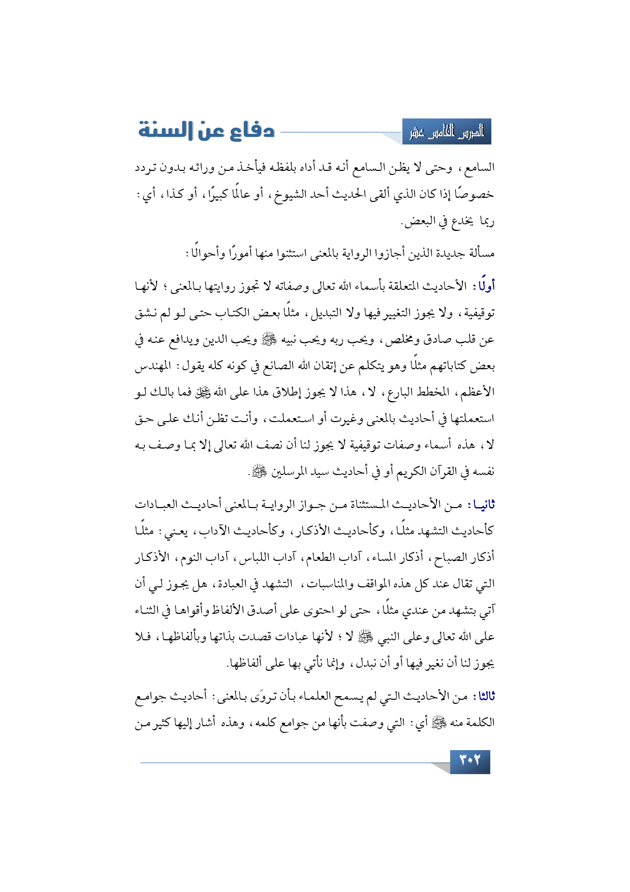 أولًا: الأحاديث المتعلقة بأسماء الله تعالى وصفاته لا تجوز روايتها بالمعنى؛ لأنها توقيفية، ولا يجوز التغيير فيها ولا التبديل، يعني: مثلًا بعض الكتاب حتى لو لم نشق عن قلب صادق ومخلص ويحب ربه ويحب نبيه -صلى الله عليه وسلم- ويحب الدين ويدافع عنه في بعض كتاباتهم مثلًا وهو يتكلم عن إتقان الله الصانع في كونه كله يقول: المهندس الأعظم، المخطط البارع، لا، هذا لا يجوز إطلاق هذا على الله -عز وجل- فما بالك لو استعملتها في أحاديث بالمعنى وغيرت أو استعملت وأنت تظن أنك على حق لا، هذه أسماء وصفات توقيفية لا يجوز لنا أن نصف الله تعالى إلا بما وصف به نفسه في القرآن الكريم أو في أحاديث سيد المرسلين -صلى الله عليه وسلم-.