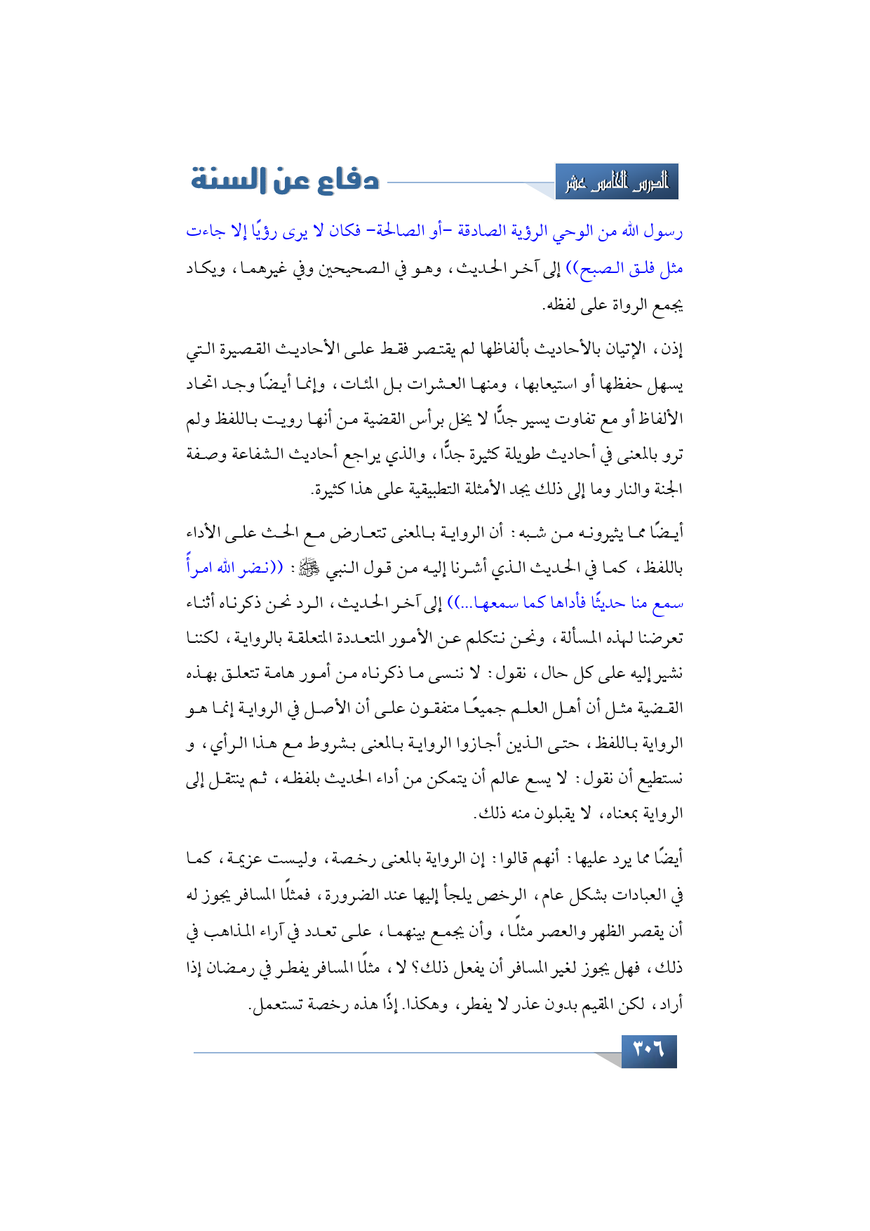 أيضًا مما يرد عليها: أنهم قالوا: إن الرواية بالمعنى رخصة وليست عزيمة، كما في العبادات بشكل عام، الرخص يلجأ إليها عند الضرورة، فمثلًا المسافر يجوز له أن يقصر الظهر والعصر مثلًا، وأن يجمع بينهما، على تعدد في آراء المذاهب في ذلك، فهل يجوز لغير المسافر أن يفعل ذلك؟ لا، مثلًا المسافر يفطر في رمضان إذا أراد، لكن المقيم بدون عذر لا يفطر، وهكذا. إذًا هذه رخصة تستعمل.