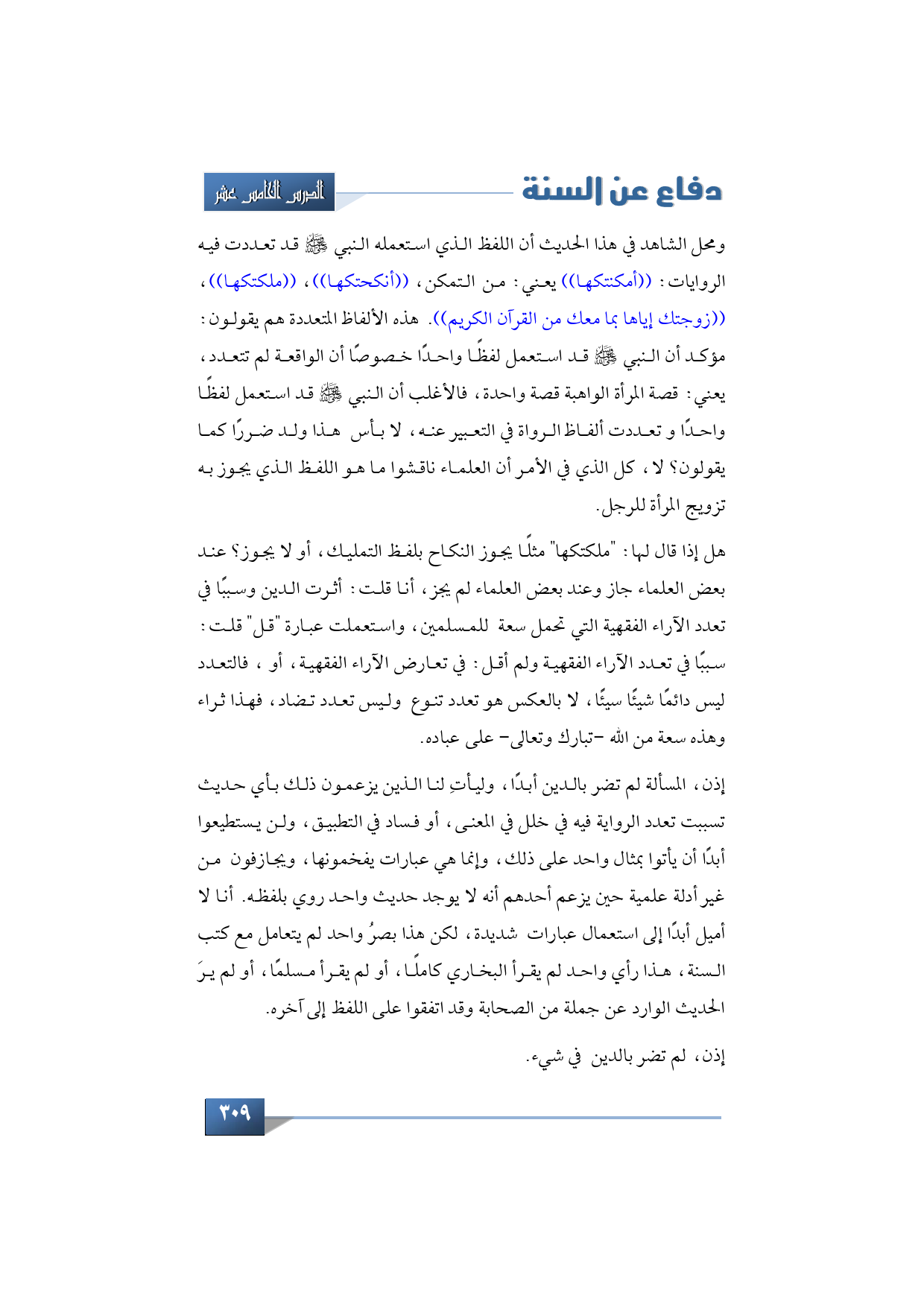 محل الشاهد أن اللفظ الذي استعمله النبي -صلى الله عليه وسلم- قد تعددت فيه الروايات: ((أمكنكتها)) يعني: من التمكن، ((أنكحتكها))، ((ملكتكها))، ((زوجتك إياها بما معك من القرآن الكريم)). هذه الألفاظ المتعددة هم يقولون: مؤكد أن النبي -صلى الله عليه وسلم- قد استعمل لفظًا واحدًا خصوصًا أن الواقعة لم تتعدد، يعني: قصة المرأة الواهبة قصة واحدة، فالأغلب أن النبي -صلى الله عليه وسلم- قد استعمل لفظًا واحدًا وتعددت ألفاظ الرواة في التعبير عنه، لا بأس هذا ولد ضررًا كما يقولون أبدًا، كل الذي في الأمر أن العلماء ناقشوا ما هو اللفظ الذي يجوز به تزويج المرأة للرجل.