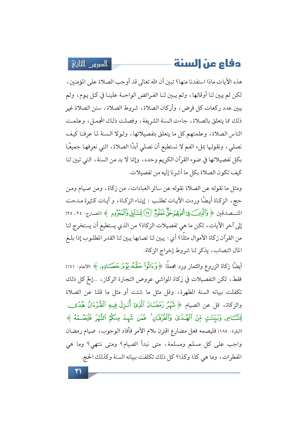 أيضًا زكاة الزروع والثمار ورد مجملًا {وَآتُوا حَقَّهُ يَوْمَ حَصَادِهِ} (الأنعام: 141) فقط، لكن التفصيلات في زكاة المواشي عروض التجارة الركاز، ... إلخ كل ذلك تكفلت ببيانه السنة المطهرة، وقل مثل ما شئت أو مثل ما قلنا عن الصلاة والزكاة، قل عن الصيام {شَهْرُ رَمَضَانَ الَّذِي أُنْزِلَ فِيهِ الْقُرْآنُ هُدًى لِلنَّاسِ وَبَيِّنَاتٍ مِنَ الْهُدَى وَالْفُرْقَانِ فَمَنْ شَهِدَ مِنْكُمُ الشَّهْرَ فَلْيَصُمْهُ} (البقرة: 185) فليصمه فعل مضارع اقترن بلام الأمر فأفاد الوجوب، صيام رمضان واجب على كل مسلم ومسلمة، متى نبدأ الصيام؟ ومتى ننتهي؟ وما هي المفطرات، وما هي كذا وكذا؟ كل ذلك تكلفت ببيانه السنة وكذلك الحج.