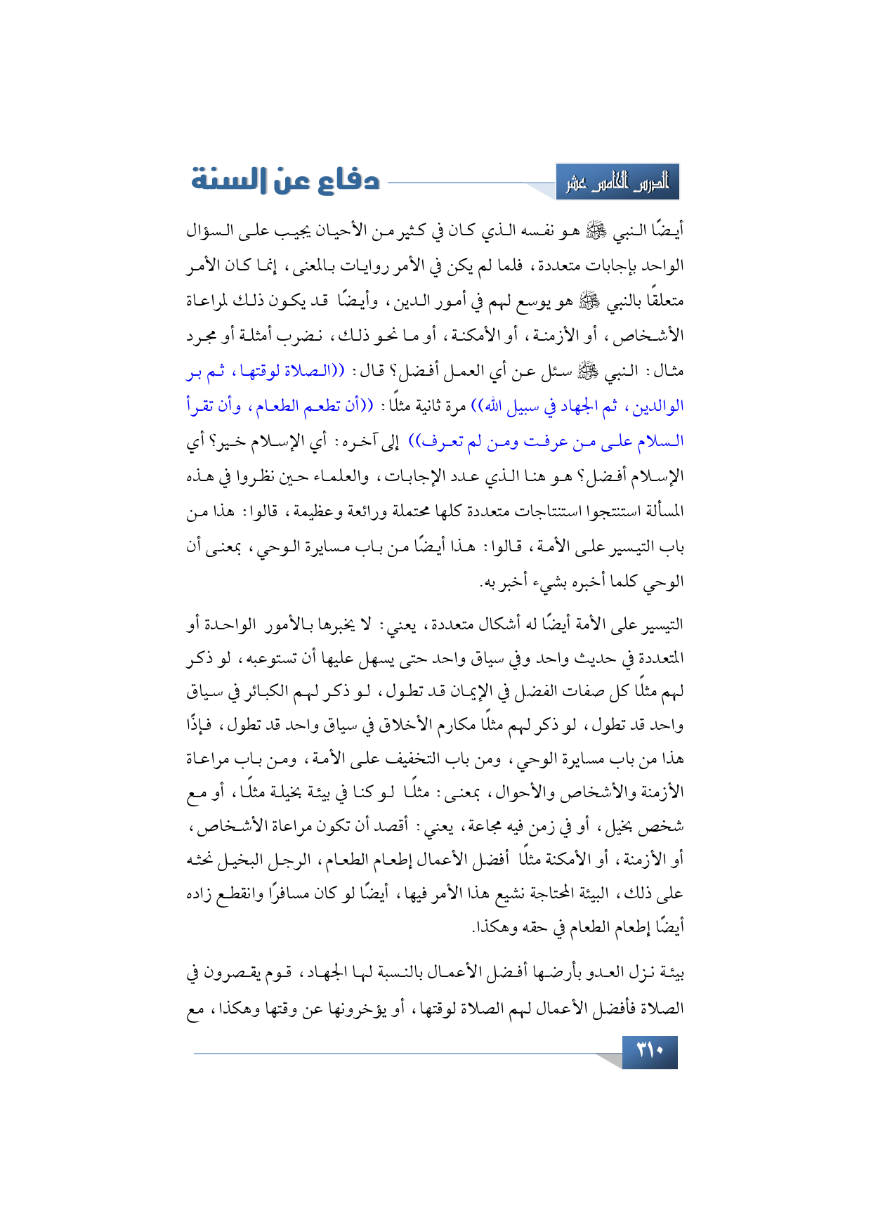 أيضًا النبي -صلى الله عليه وسلم- هو نفسه الذي كان في كثير من الأحيان يجيب على السؤال الواحد بإجابات متعددة، فلم لم يكن في الأمر روايات بالمعنى، إنما كان الأمر متعلقًا بالنبي -صلى الله عليه وسلم- هو يوسع لهم في أمور الدين، وأيضًا قد يكون ذلك لمراعاة الأشخاص، أو الأزمنة، أو الأمكنة، أو ما نحو ذلك، نضرب أمثلة أو مجرد مثال: النبي -صلى الله عليه وسلم- سئل عن أي العمل أفضل؟ قال: ((الصلاة لوقتها، ثم بر الوالدين، ثم الجهاد في سبيل الله)) مرة ثانية مثلًا: ((أن تطعم الطعام، وأن تقرأ السلام على من عرفت ومن لم تعرف)) إلى آخره: أي الإسلام خير؟ أي الإسلام أفضل؟ هو هنا الذي عدد الإجابات، والعلماء حين نظروا في هذه المسألة استنتجوا استنتاجات متعددة كلها محتملة ورائعة وعظيمة، قالوا: هذا من باب التيسير على الأمة، قالوا: هذا أيضًا من باب مسايرة الوحي، بمعنى أن الوحي كلما أخبره بشيء أخبر به.