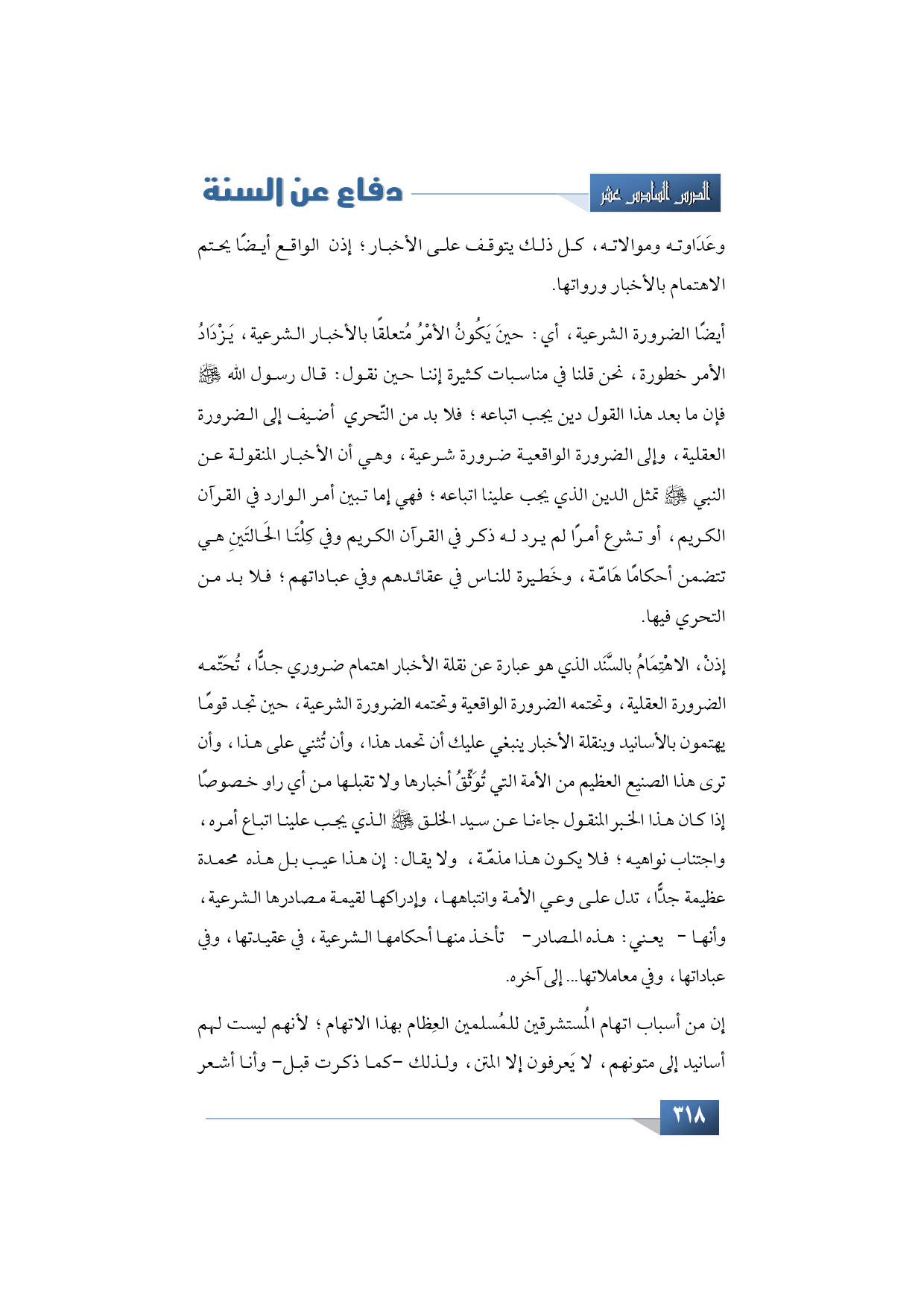 إذن، أيضًا الضرورة الشرعية، يعني: حينَ يَكُونُ الأمْرُ مُتعلقًا بالأخبار الشرعية، يَزْدَادُ الأمر خطورة، نحن قلنا في مناسبات كثيرة إننا حين نقول: قال رسول الله -صلى الله عليه وسلم- فإن ما بعد هذا القول دين يجب اتباعه؛ فلا بد من التّحري أضيف إلى الضرورة العقلية وإلى الضرورة الواقعية ضرورة شرعية، وهي أن الأخبار المنقولة عن النبي -صلى الله عليه وسلم- تمثل الدين الذي يجب علينا اتباعه؛ فهي إما تبين أمر الوارد في القرآن الكريم، أو تشرع أمرًا لم يرد له ذكر في القرآن الكريم وفي كِلْتَا الحَالتَينِ هي تتضمن أحكامًا هَامّة، وخَطيرة للناس في عقائدهم وفي عباداتهم؛ فلا بد من التحري فيها.