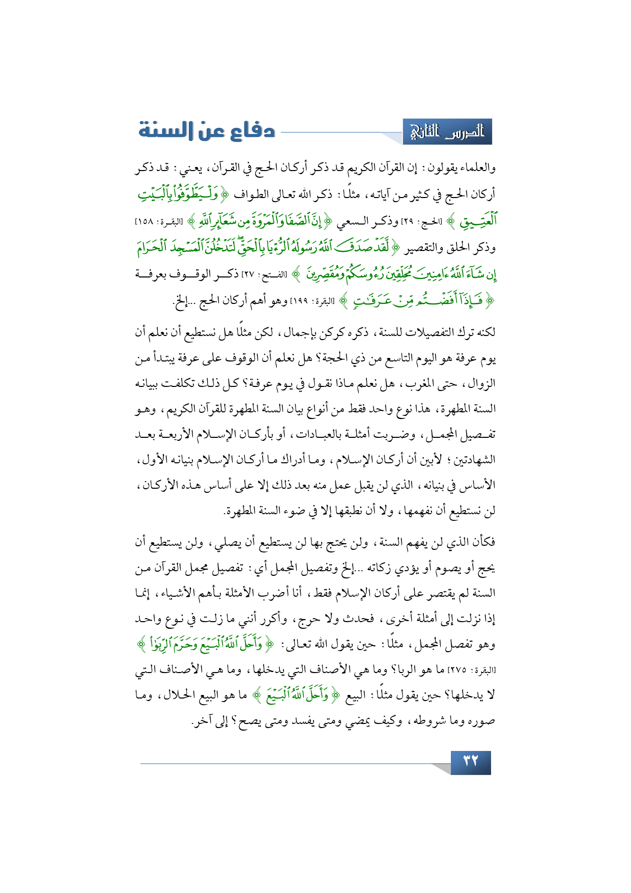 لكنه ترك التفصيلات للسنة، ذكره كركن بإجمال، لكن مثلًا هل نستطيع أن نعلم أن يوم عرفة هو اليوم التاسع من ذي الحجة؟ هل نعلم أن الوقوف على عرفة يبتدأ من الزوال، حتى المغرب، هل نعلم ماذا نقول في يوم عرفة؟ كل ذلك تكلفت ببيانه السنة المطهرة، أنا لا زلت أتكلم عن نوع واحد من أنواع بيان السنة المطهرة للقرآن الكريم، وهو تفصيل المجمل، وضربت أمثلة بالعبادات، أو بأركان الإسلام الأربعة بعد الشهادتين؛ لأبين أن أركان الإسلام، وما أدراك ما أركان الإسلام بنيانه الأول، الأساس في بنيانه، الذي لن يقبل عمل منه بعد ذلك إلا على أساس هذه الأركان، لن نستطيع أن نفهمها، ولا أن نطبقها إلا في ضوء السنة المطهرة.