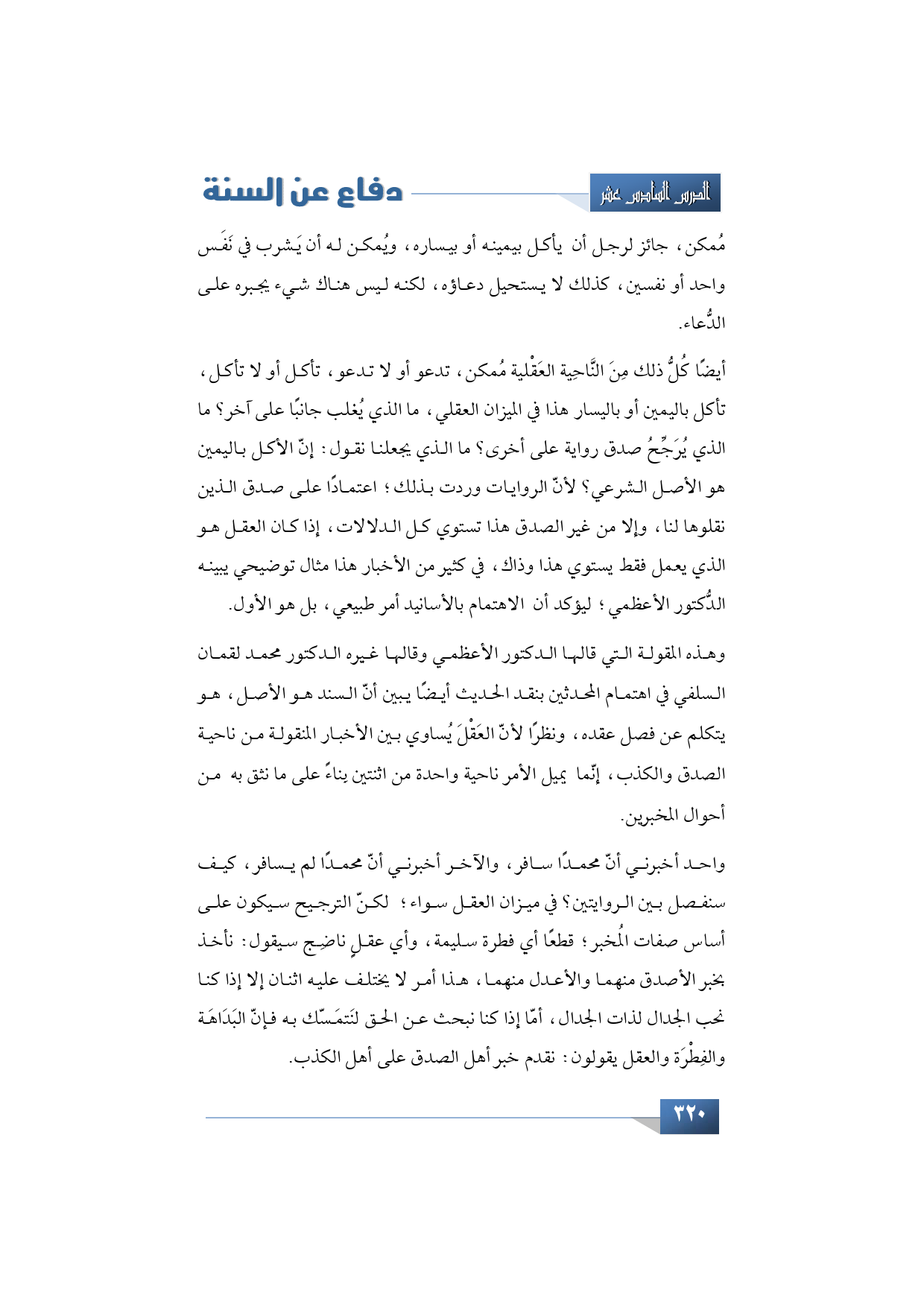 أيضًا كُلُّ ذلك مِنَ النَّاحِية العَقْلية مُمكن، تدعو أو لا تدعو، تأكل أو لا تأكل، تأكل باليمين أو باليسار هذا في الميزان العقلي، ما الذي يُغلب جانبًا على آخر؟ ما الذي يُرَجِّحُ صدق رواية على أخرى؟ ما الذي يجعلنا نقول: إنّ الأكل باليمين هو الأصل الشرعي؟ لأنّ الروايات وردت بذلك؛ اعتمادًا على صدق الذين نقلوها لنا، وإلا من غير الصدق هذا تستوي كل الدلالات، إذا كان العقل هو الذي يعمل فقط يستوي هذا وذاك، في كثير من الأخبار هذا مثال توضيحي يبينه الدُّكتور الأعظمي؛ ليؤكد أن الاهتمام بالأسانيد أمر طبيعي، بل هو الأول.