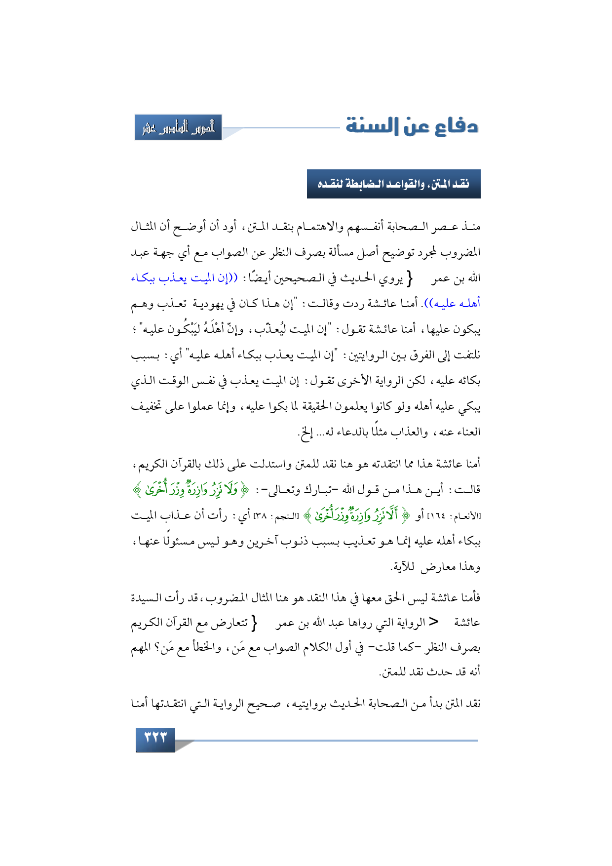أمنا عائشة هذا مما انتقدته هو هنا نقد للمتن واستدلت على ذلك بالقرآن الكريم، قالت: أين هذا من قول الله -تبارك وتعالى-: {وَلَا تَزِرُ وَازِرَةٌ وِزْرَ أُخْرَى} (الأنعام: 164) أو {أَلَّا تَزِرُ وَازِرَةٌ وِزْرَ أُخْرَى} (النجم: 38) يعني: رأت أن عذاب الميت ببكاء أهله عليه إنما هو تعذيب بسبب ذنوب آخرين هو ليس مسئولًا عنها، سيتعارض مع الآية.