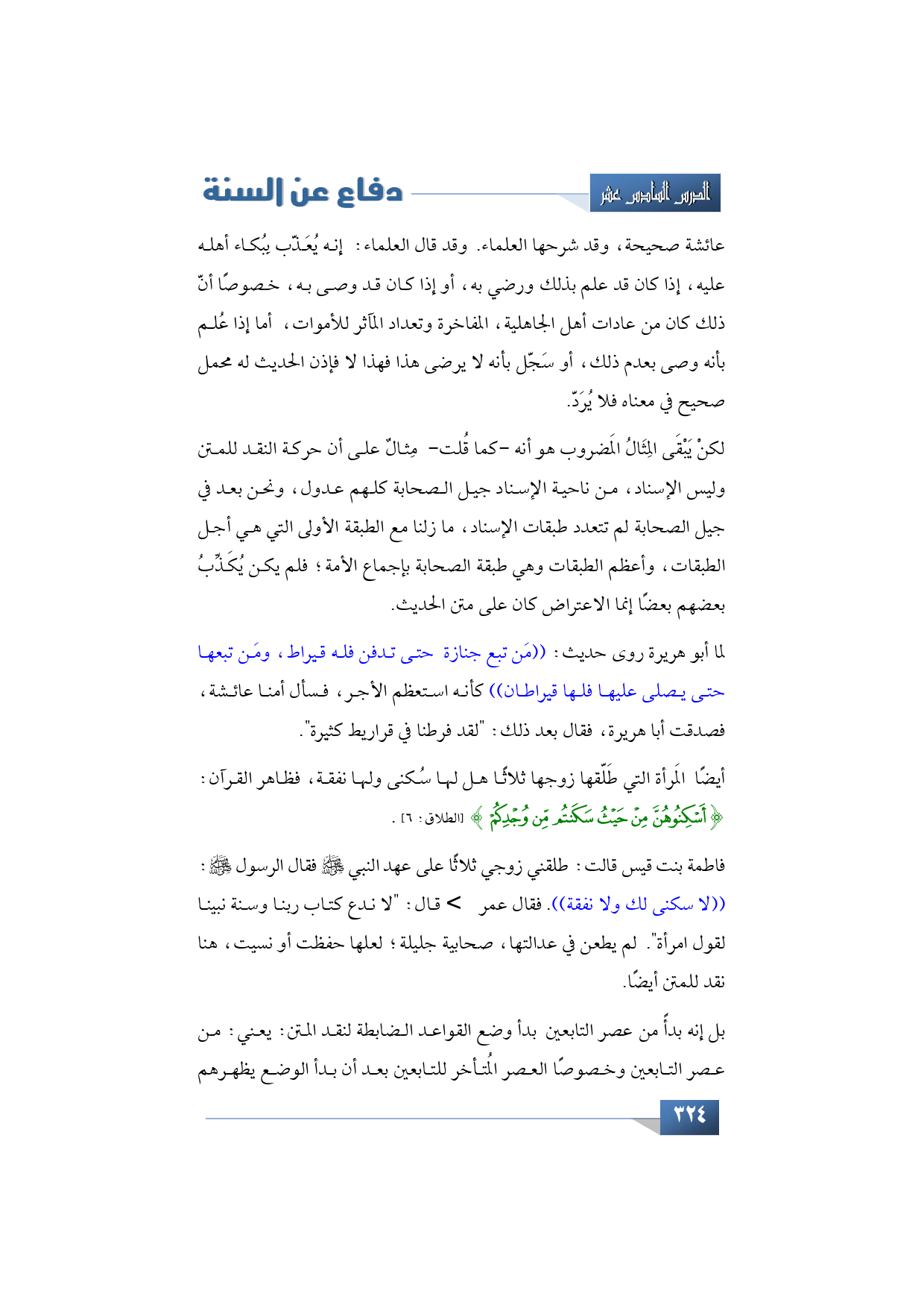 فاطمة بنت قيس قالت: طلقني زوجي ثلاثًا على عهد النبي -صلى الله عليه وسلم- فقال الرسول -صلى الله عليه وسلم-: ((لا سكنى لك ولا نفقة)). فقال عمر -رضي الله عنه- قال: "لا ندع كتاب ربنا وسنة نبينا لقول امرأة". لم يطعن في عدالتها، صحابية جليلة؛ لعلها حفظت أو نسيت، هنا نقد للمتن أيضًا.