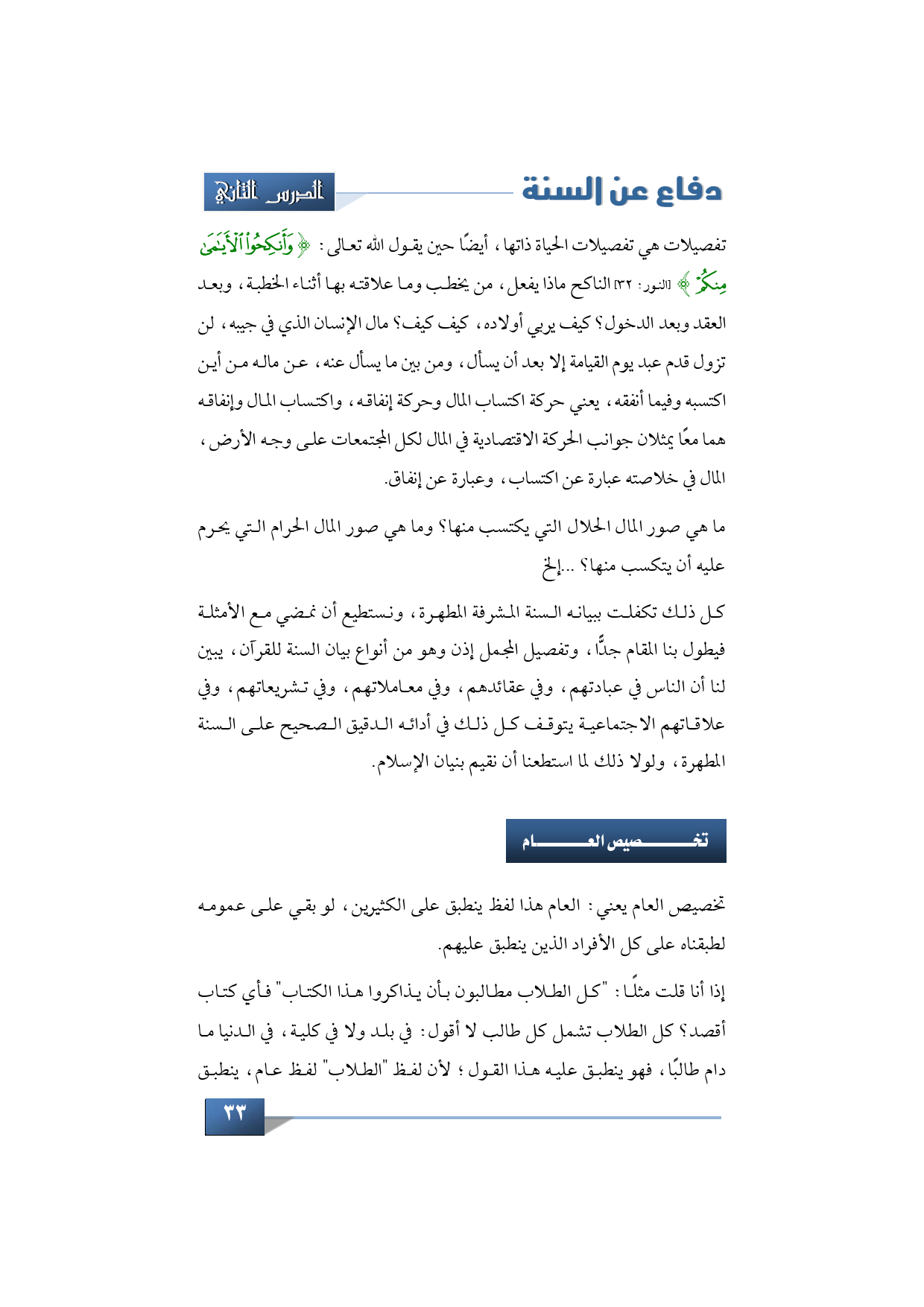 تفصيلات هي تفصيلات الحياة ذاتها، أيضًا مثلًا: حين يقول الله تعالى: {وَأَنْكِحُوا الْأَيَامَى مِنْكُمْ} (النور: 32) الناكح ماذا يفعل، من يخطب وما علاقته بها أثناء الخطبة، وبعد العقد وبعد الدخول؟ كيف يربي أولاده، كيف كيف؟ مال الإنسان الذي في جيبه، لن تزول قدم عبد يوم القيامة إلا بعد أن يسأل، ومن بين ما يسأل عنه، عن ماله من أين اكتسبه وفيما أنفقه، يعني حركة اكتساب المال وحركة إنفاقه، واكتساب المال وإنفاقه هما معًا يمثلان جوانب الحركة الاقتصادية في المال لكل المجتمعات على وجه الأرض، المال في خلاصته عبارة عن اكتساب، وعبارة عن إنفاق.