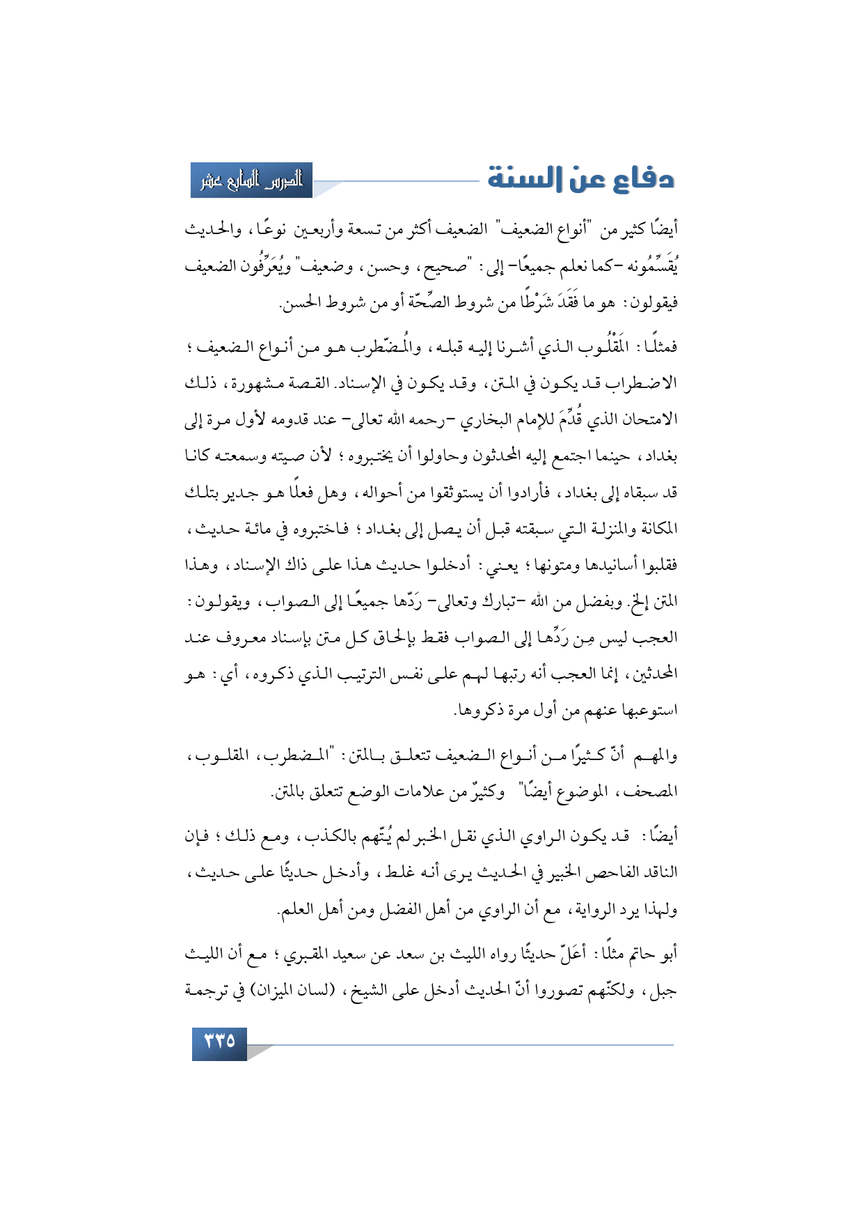 والمهم أنّ كثيرًا من أنواع الضعيف تتعلق بالمتن: "المضطرب، المقلوب، المصحف، الموضوع أيضًا" وكثيرٌ من علامات الوضع تتعلق بالمتن.