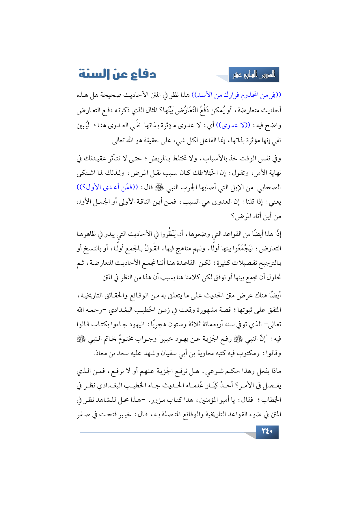 ((فِر من المجذوم فرارك من الأسد)) هذا نظر في المتن الأحاديث صحيحة هل هذه أحاديث متعارضة، أو يُمكن دَفْعُ التّعَارُض بَيْنَها؟ المثال الذي ذكرته دفع التعارض واضح فيه: ((لا عدوى)) أي: لا عدوى مؤثرة بذاتها. نفَي العدوى هنا؛ ليُبين نفي إنها مؤثرة بذاتها، إنما الفاعل لكل شيء على حقيقة هو الله تعالى.
