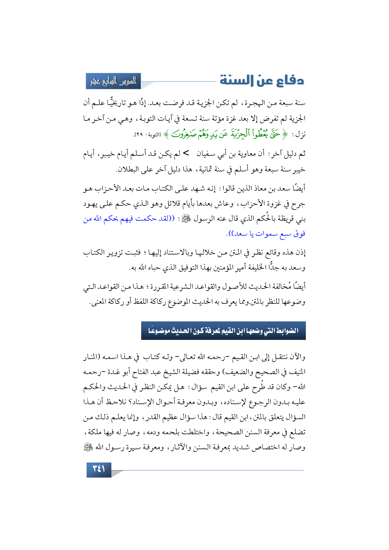 والآن ننتقل إلى ابن القيم -رحمه الله تعالى- وله كتاب في هذا اسمه (المنار المنيف في الصحيح والضعيف) وحققه فضيلة الشيخ عبد الفتاح أبو غدة -رحمه الله- وكان قد طُرح على ابن القيم سؤال: هل يمكن النظر في الحديث والحكم عليه بدون الرجوع لإسناده، وبدون معرفة أحوال الإسناد؟ نلاحظ أن هذا السؤال يتعلق بالمتن، ابن القيم قال: هذا سؤال عظيم القدر، وإنما يعلم ذلك من تضلع في معرفة السنن الصحيحة، واختلطت بلحمه ودمه، وصار له فيها ملكة، وصار له اختصاص شديد بمعرفة السنن والآثار، ومعرفة سيرة رسول الله -صلى الله عليه وسلم-