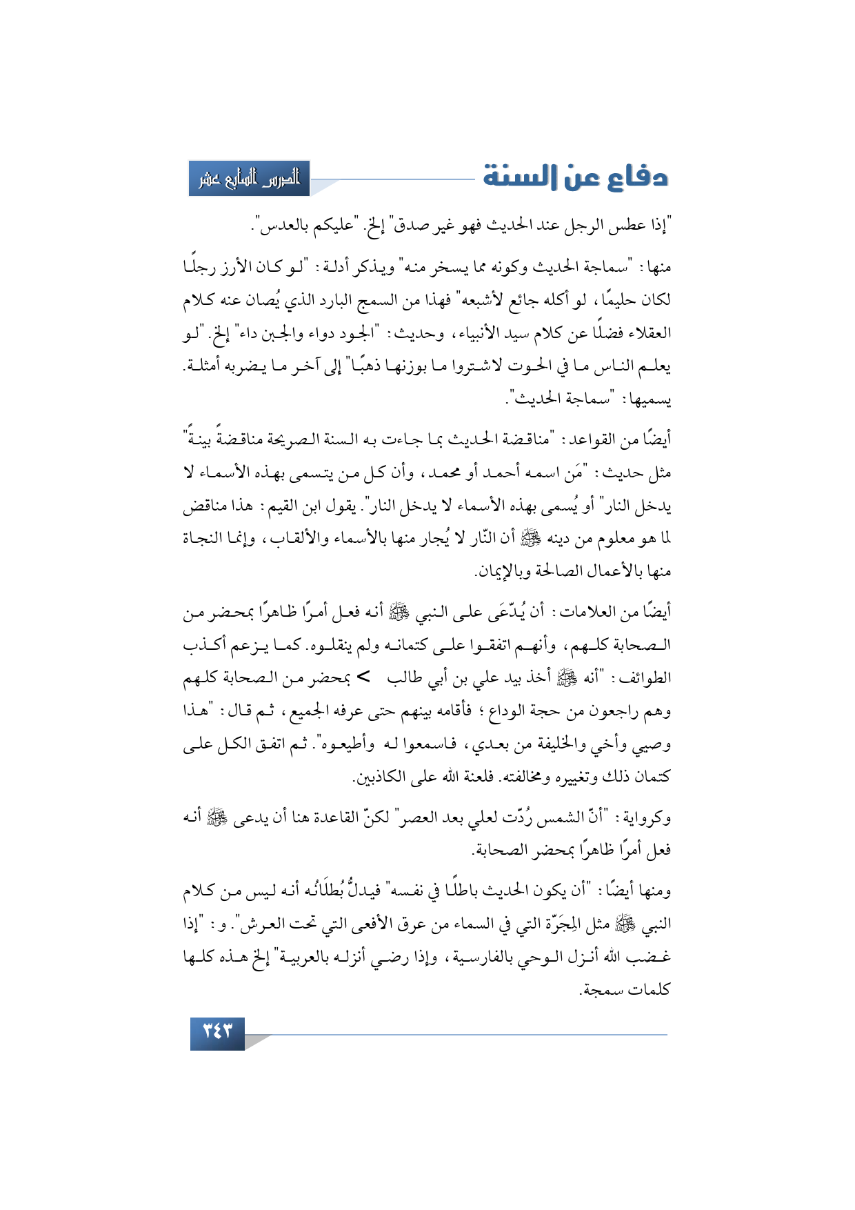 أيضًا من القواعد: "مناقضة الحديث بما جاءت به السنة الصريحة مناقضةً بينةً" مثل حديث: "مَن اسمه أحمد أو محمد، وأن كل من يتسمى بهذه الأسماء لا يدخل النار" أو يُسمى بهذه الأسماء لا يدخل النار". يقول ابن القيم: هذا مناقض لما هو معلوم من دينه -صلى الله عليه وسلم- أن النّار لا يُجار منها بالأسماء والألقاب، وإنما النجاة منها بالأعمال الصالحة وبالإيمان.