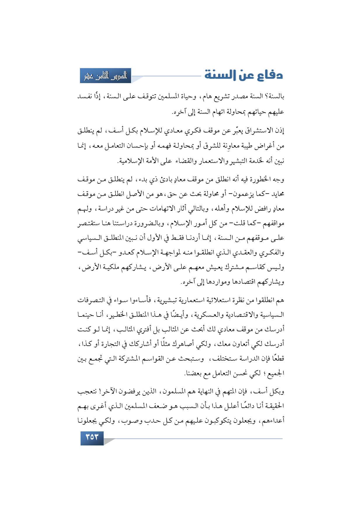 وجه الخطورة فيه أنه انطلق من موقف معادٍ بادئ ذي بدء، لم ينطلق من موقف محايد -كما يزعمون- أو محاولة بحث عن حق، هو من الأصل انطلق من موقف معادٍ رافض للإسلام وأهله، وبالتالي أثار الاتهامات حتى من غير دراسة، ولهم مواقفهم -كما قلت- من كل أمور الإسلام، وبالضرورة دراستنا هنا ستقتصر على موقفهم من السنة، إنما أردنا فقط في الأول أن نبين المنطلق السياسي والفكري والعقدي الذي انطلقوا منه لمواجهة الإسلام كعدو -بكل أسف- وليس كقاسم مشترك يعيش معهم على الأرض، يشاركهم ملكية الأرض، ويشاركهم اقتصادها ومواردها إلى آخره.