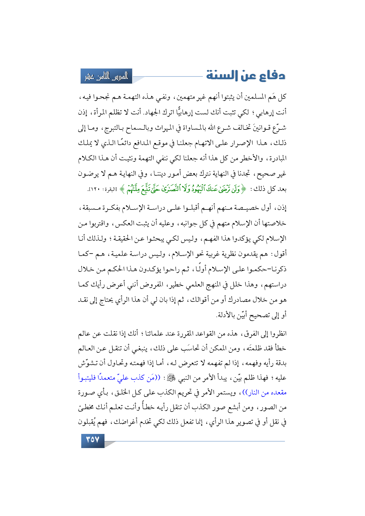 كل هَم المسلمين أن يثبتوا أنهم غير متهمين، ونفي هذه التهمة هم نجحوا فيه، أنت إرهابي؛ لكي تثبت أنك لست إرهابيًّا اترك الجهاد. أنت لا تظلم المرأة، إذن شرّع قوانينَ تخالف شرع الله بالمساواة في الميراث وبالسماح بالتبرج، وما إلى ذلك، هذا الإصرار على الاتهام جعلنا في موقع المدافع دائمًا الذي لا يملك المبادرة، والأخطر من كل هذا أنه جعلنا لكي ننفي التهمة ونثبِت أن هذا الكلام غير صحيح، تجدنا في النهاية نترك بعض أمور ديننا، وفي النهاية هم لا يرضون بعد كل ذلك: {وَلَنْ تَرْضَى عَنْكَ الْيَهُودُ وَلَا النَّصَارَى حَتَّى تَتَّبِعَ مِلَّتَهُمْ} (البقرة: 120).