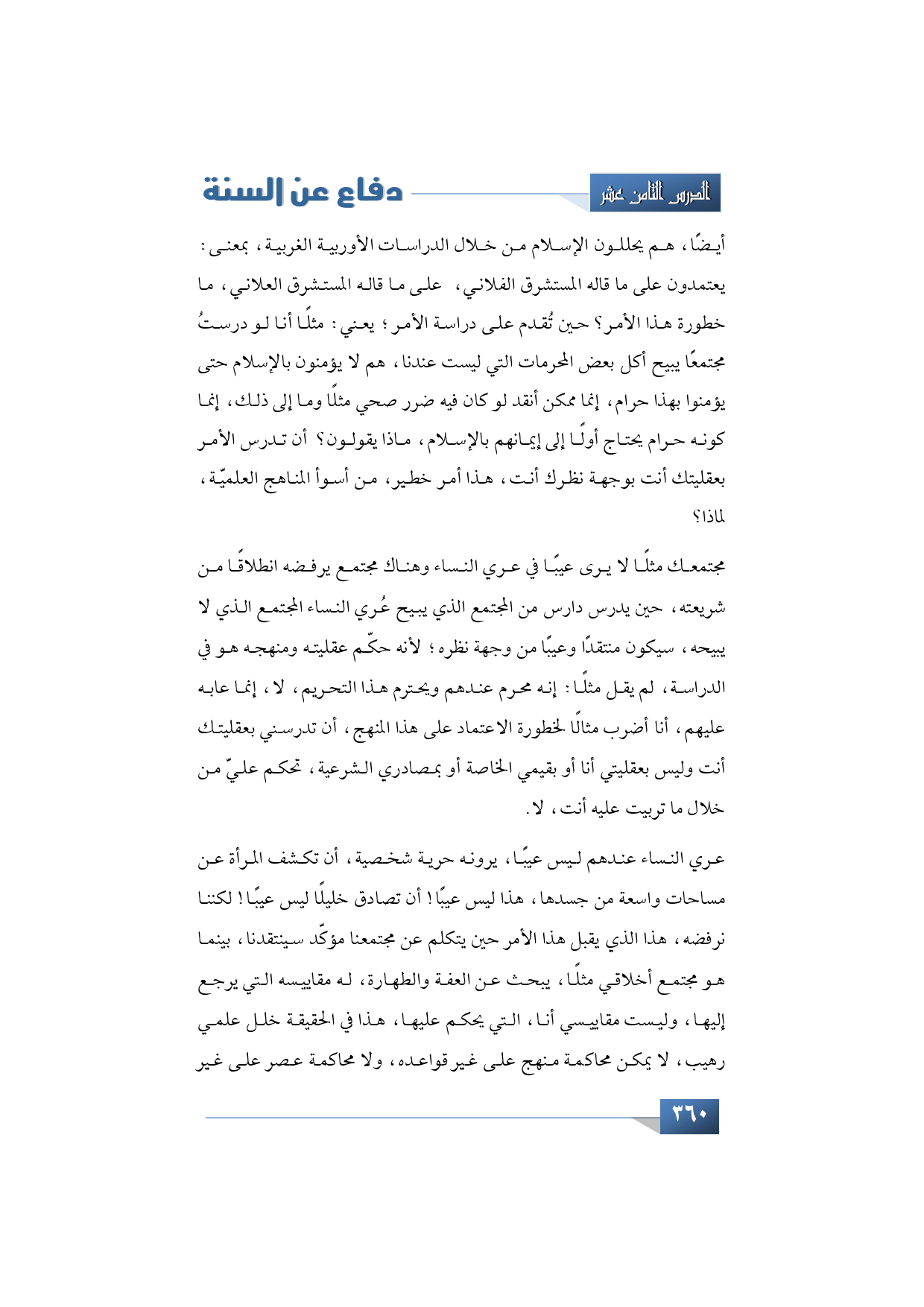 أيضًا، هم يحللون الإسلام من خلال الدراسات الأوربية الغربية، بمعنى: يعتمدون على ما قاله المستشرق الفلاني، على ما قاله المستشرق العلاني، ما خطورة هذا الأمر؟ حين تُقدم على دراسة الأمر؛ يعني: مثلًا أنا لو درستُ مجتمعًا يبيح أكل بعض المحرمات التي ليست عندنا، هم لا يؤمنون بالإسلام حتى يؤمنوا بهذا حرام، إنما ممكن أنقد لو كان فيه ضرر صحي مثلًا وما إلى ذلك، إنما كونه حرام يحتاج أولًا إلى إيمانهم بالإسلام، ماذا يقولون؟ أن تدرس الأمر بعقليتك أنت بوجهة نظرك أنت، هذا أمر خطير، من أسوأ المناهج العلميّة، لماذا؟