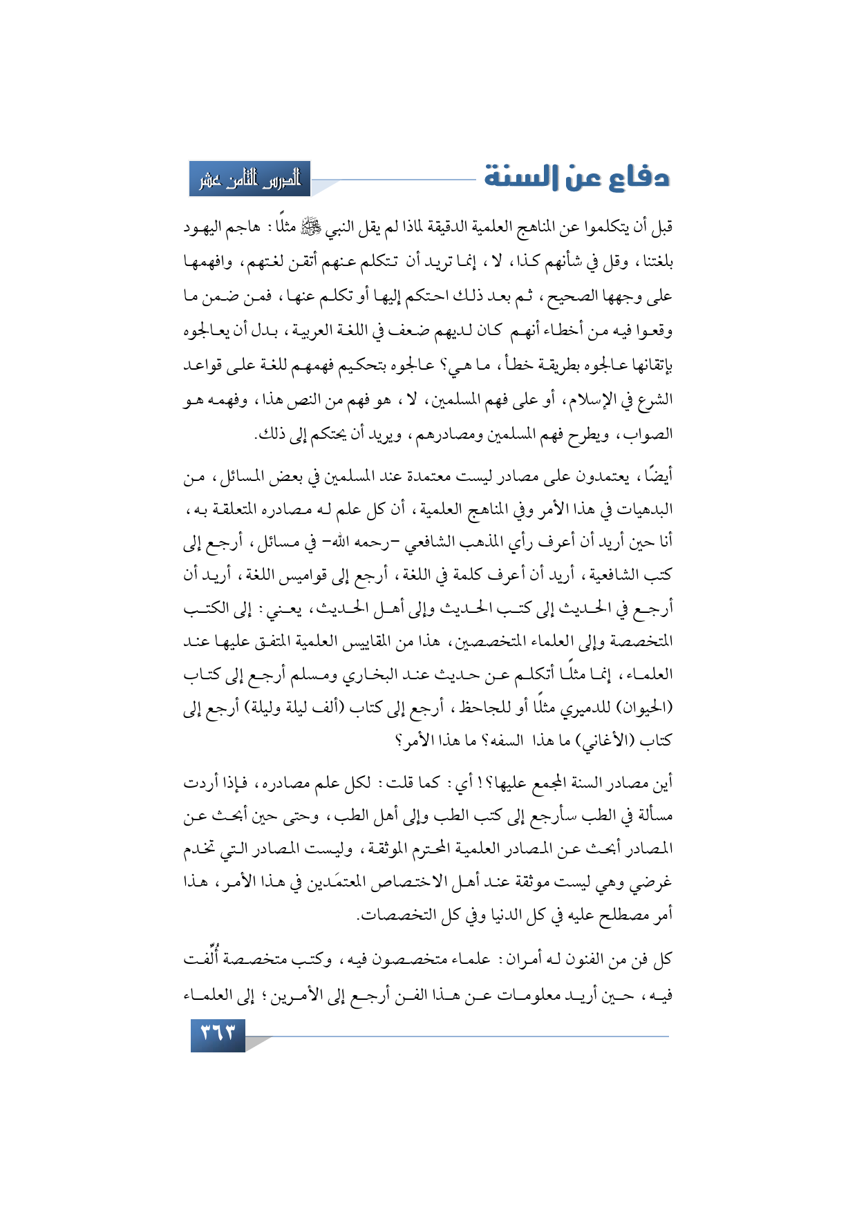 قبل أن يتكلموا عن المناهج العلمية الدقيقة لماذا لم يقل النبي -صلى الله عليه وسلم- مثلًا: هاجم اليهود بلغتنا، وقل في شأنهم كذا، لا، إنما تريد أن تتكلم عنهم أتقن لغتهم، وافهمها على وجهها الصحيح، ثم بعد ذلك احتكم إليها أو تكلم عنها، فمن ضمن ما وقعوا فيه من أخطاء أنهم كان لديهم ضعف في اللغة العربية، بدل أن يعالجوه بإتقانها عالجوه بطريقة خطأ، ما هي؟ عالجوه بتحكيم فهمهم للغة على قواعد الشرع في الإسلام، أو على فهم المسلمين، لا، هو فهم من النص هذا، وفهمه هو الصواب، ويطرح فهم المسلمين ومصادرهم، ويريد أن يحتكم إلى ذلك.