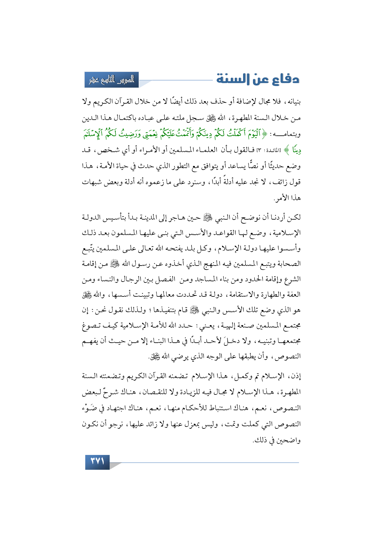 إذن، الإسلام تم وكمل، هذا الإسلام تضمنه القرآن الكريم وتضمنته السنة المطهرة، هذا الإسلام لا مجال فيه للزيادة ولا للنقصان، هناك شرحٌ لبعض النصوص، نعم، هناك استنباط للأحكام منها، نعم، هناك اجتهاد في ضَوْء النصوص التي كملت وتمت، وليس بمعزل عنها ولا زائد عليها، نرجو أن نكون واضحين في ذلك.
