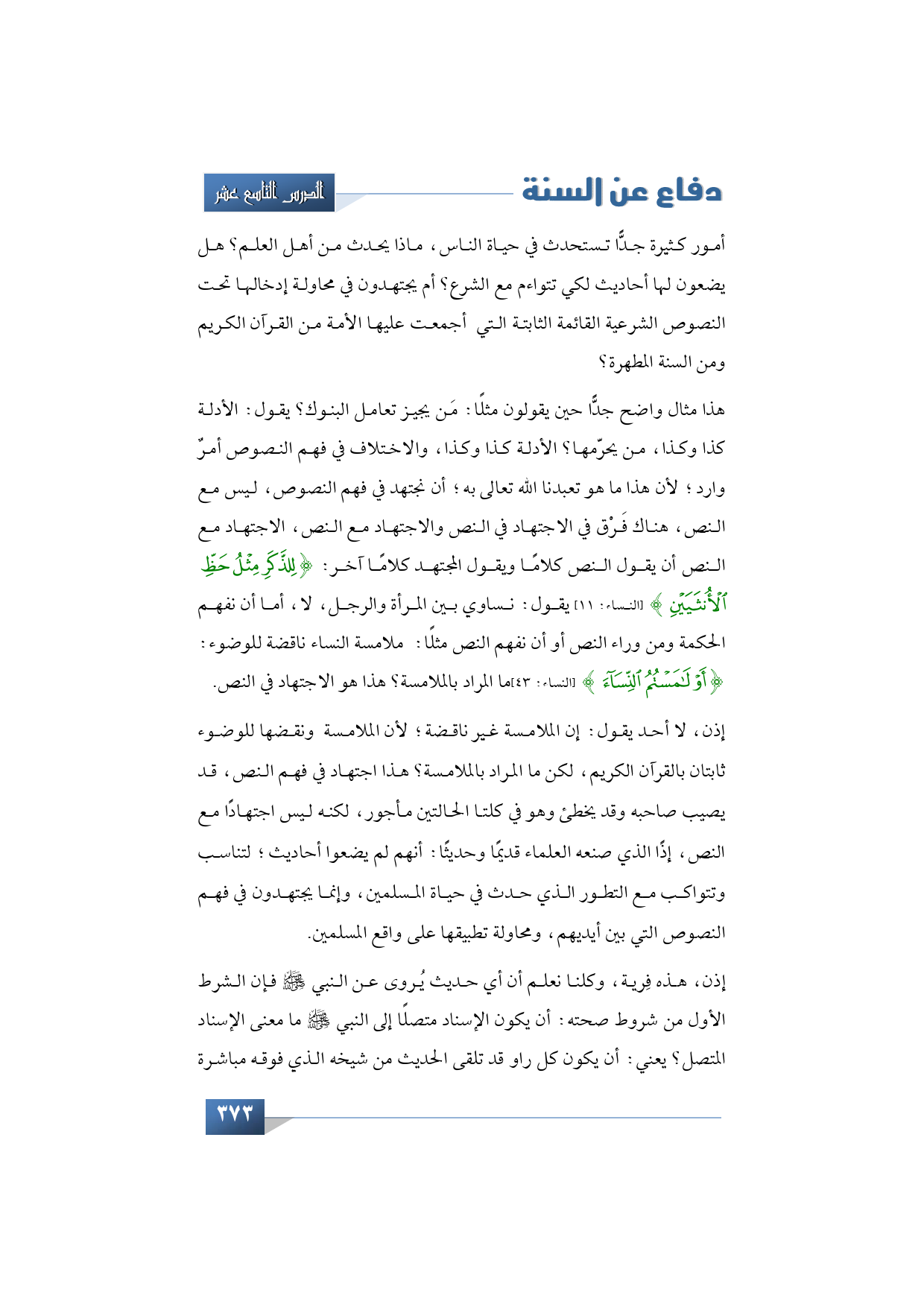 إذن، لا أحد يقول: إن الملامسة غير ناقضة؛ لأن الملامسة ونقضها للوضوء ثابتان بالقرآن الكريم، لكن ما المراد بالملامسة؟ هذا اجتهاد في فهم النص، قد يصيب صاحبه وقد يخطئ وهو في كلتا الحالتين مأجور، لكنه ليس اجتهادًا مع النص، إذًا الذي صنعه العلماء قديمًا وحديثًا: أنهم لم يضعوا أحاديث؛ لتناسب وتتواكب مع التطور الذي حدث في حياة المسلمين، وإنما يجتهدون في فهم النصوص التي بين أيديهم، ومحاولة تطبيقها على واقع المسلمين.