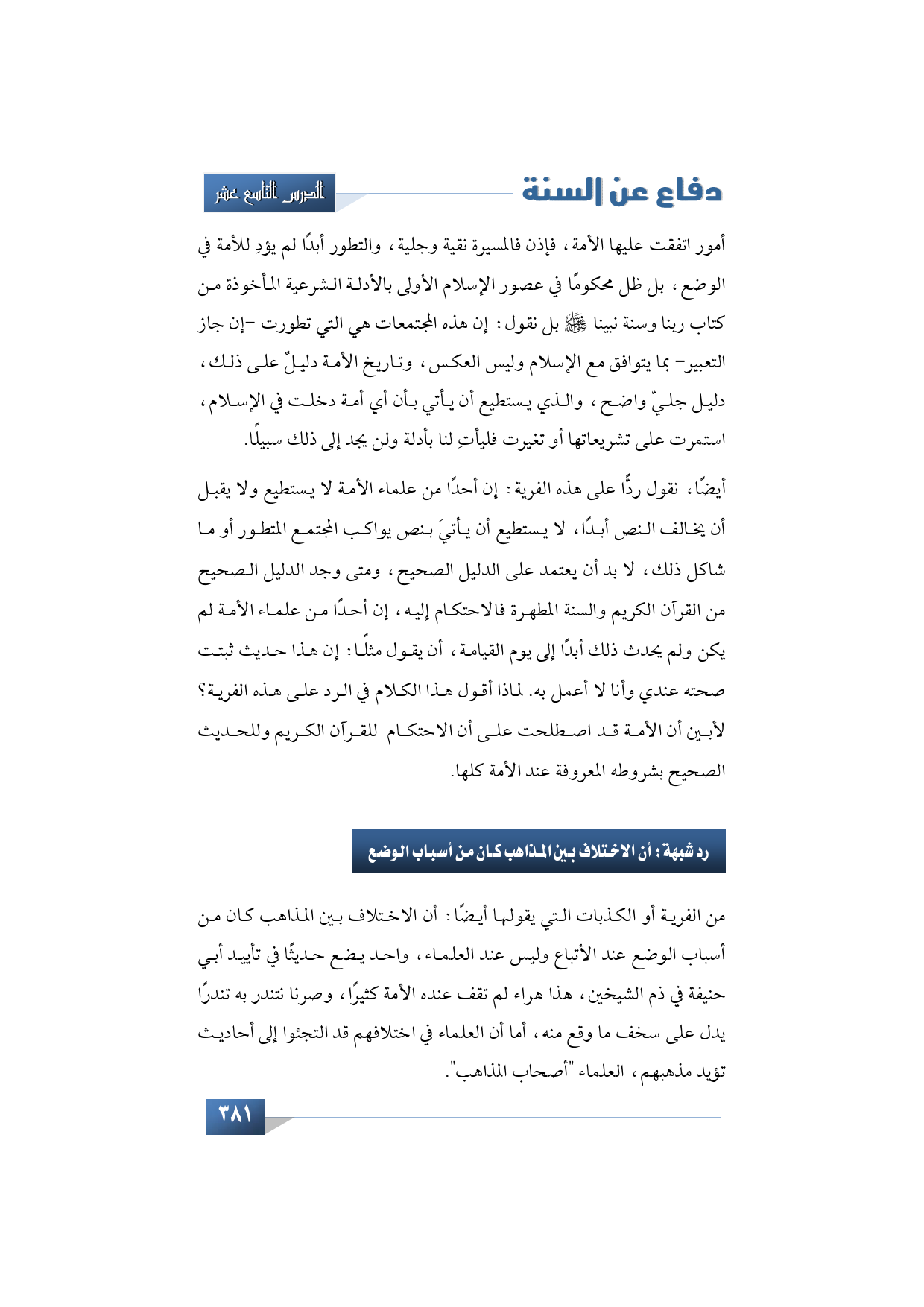 من الفرية أو الكذبات التي يقولها أيضًا: أن الاختلاف بين المذاهب كان من أسباب الوضع عند الأتباع وليس عند العلماء، واحد يضع حديثًا في تأييد أبي حنيفة في ذم الشيخين، هذا هراء لم تقف عنده الأمة كثيرًا، وصرنا نتندر به تندرًا يدل على سخف ما وقع منه، أما أن العلماء في اختلافهم قد التجئوا إلى أحاديث تؤيد مذهبهم، العلماء "أصحاب المذاهب"! أعوذ بالله هذه الفرية الظالمة.