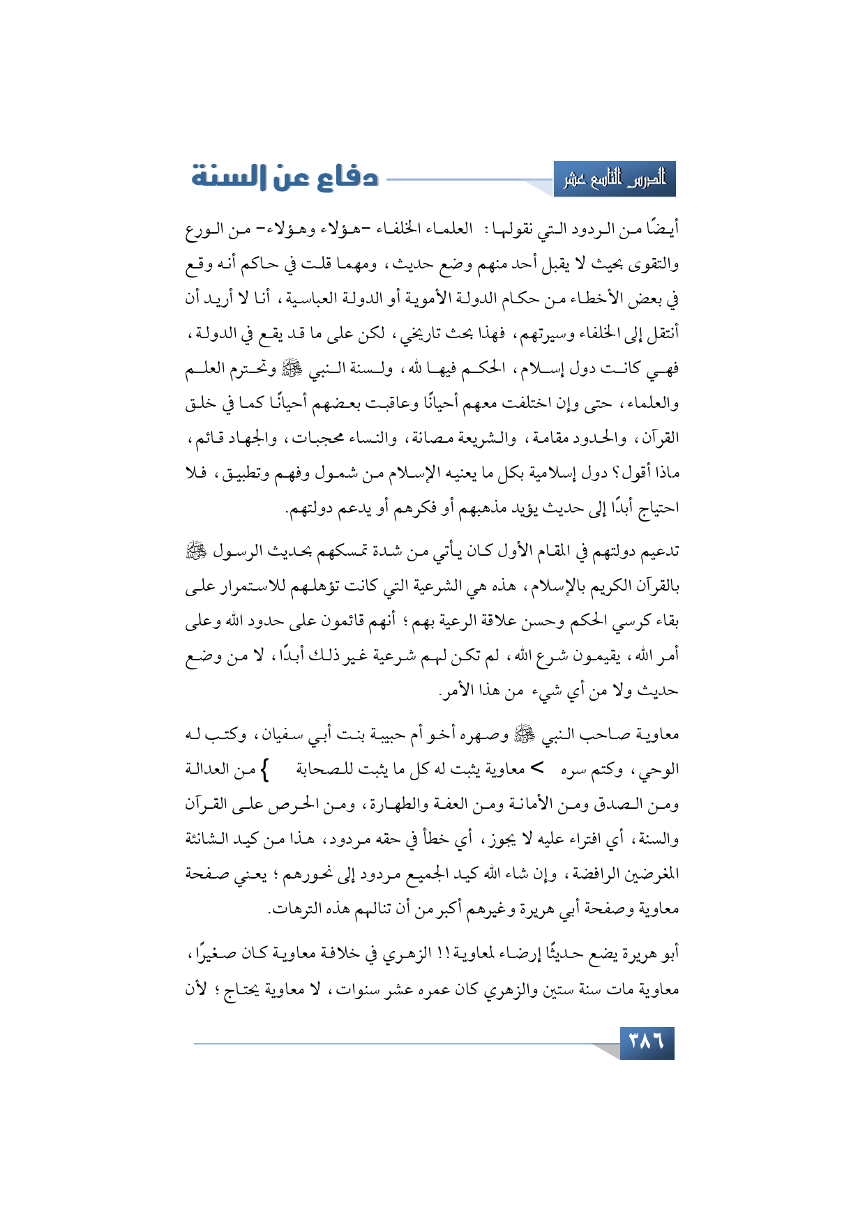 أيضًا من الردود التي نقولها: العلماء الخلفاء -هؤلاء وهؤلاء- من الورع والتقوى بحيث والله لا يقبل أحد منهم وضع حديث، ومهما قلت في حاكم أنه وقع في بعض الأخطاء من حكام الدولة الأموية أو الدولة العباسية، أنا لا أريد أن أنتقل إلى الخلفاء وسيرتهم، هذا بحث تاريخي، لكن على ما قد يقع في الدولة، فهي كانت دول إسلام، الحكم فيها لله، ولسنة النبي -صلى الله عليه وسلم- وتحترم العلم والعلماء، حتى وإن اختلفت معهم أحيانًا وعاقبت بعضهم أحيانًا كما في خلق القرآن، والحدود مقامة، والشريعة مصانة، والنساء محجبات، والجهاد قائم، ماذا أقول؟ دول إسلامية بكل ما يعنيه الإسلام من شمول وفهم وتطبيق، فلا احتياج أبدًا إلى حديث يؤيد مذهبهم أو فكرهم أو يدعم دولتهم.