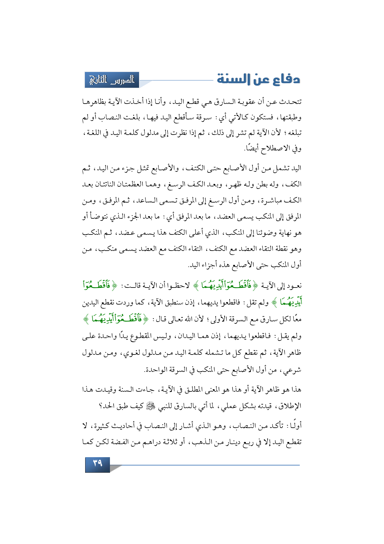 تتحدث عن أن عقوبة السارق هي قطع اليد، وأنا إذا أخذت الآية بظاهرها وطبقتها، فستكون كالأتي أي سرقة سأقطع اليد فيها، بلغت النصاب أو لم تبلغه؛ لأن الآية لم تشر إلى ذلك، ثم إذا نظرت إلى مدلول كلمة اليد في اللغة، وفي الاصطلاح أيضًا، في المفهوم الشرعي أقصد.